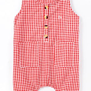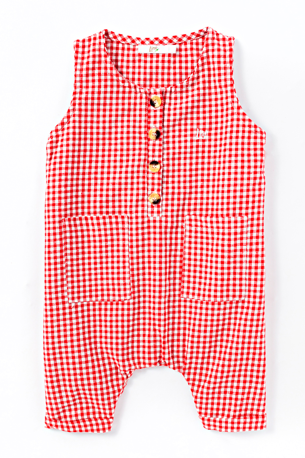 Macacão Infantil de Linho Curto Sem Mangas e Bolsos Xadrez