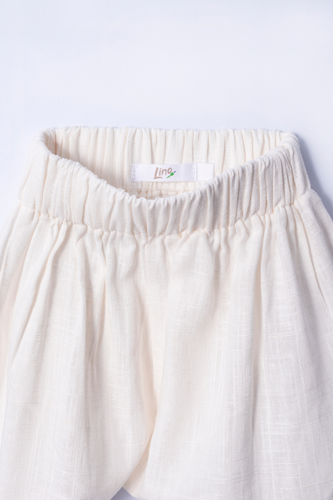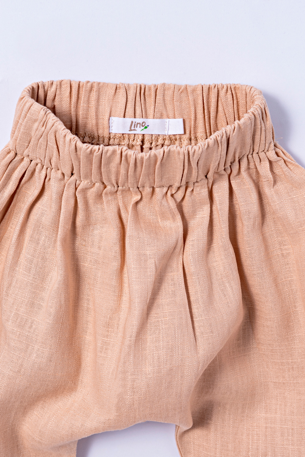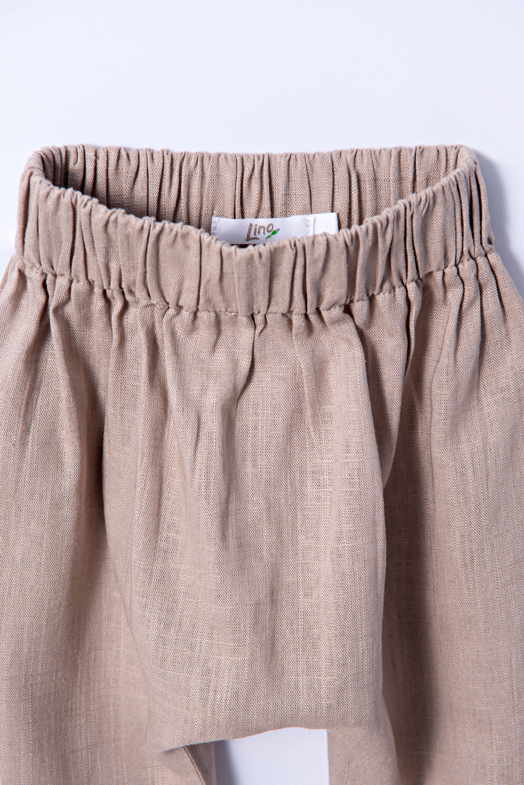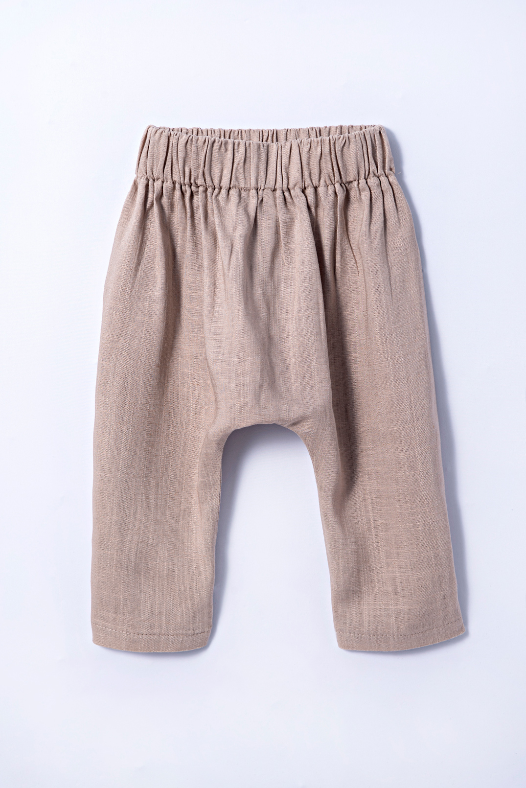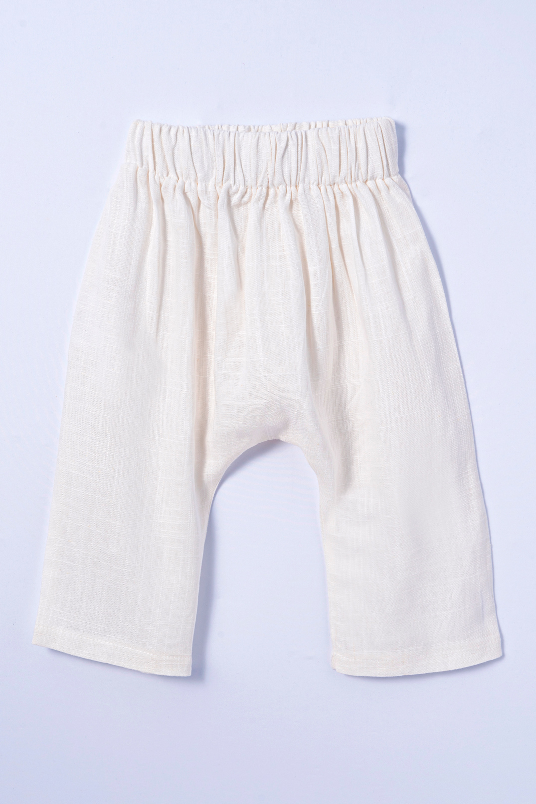 Calça despojada de modelo saruel com cós de elástico. Tecido de linho.