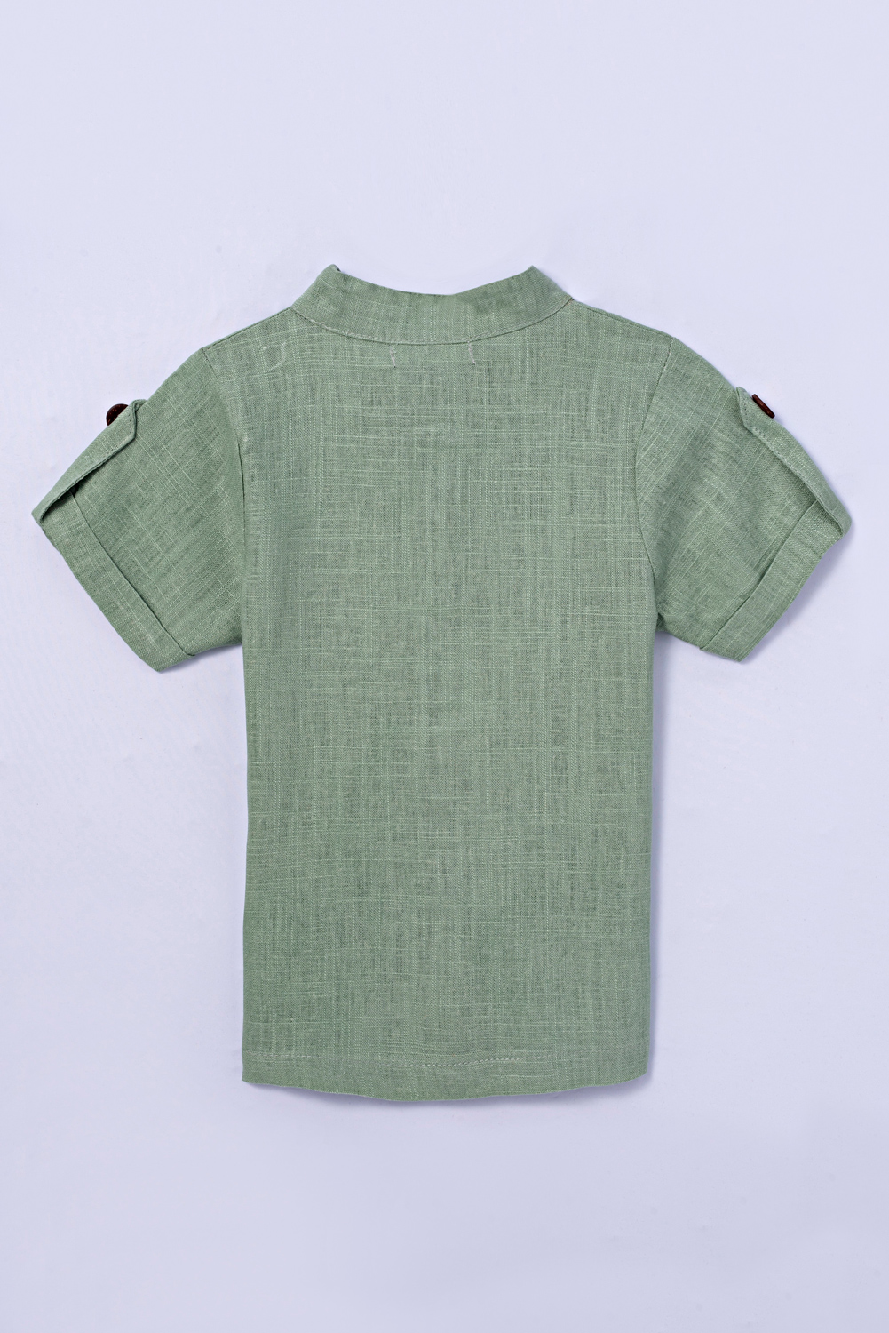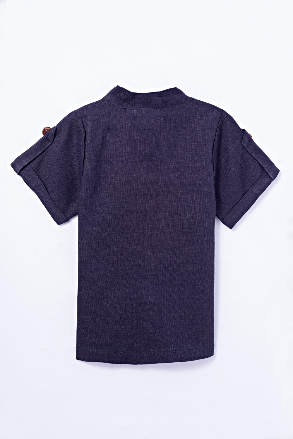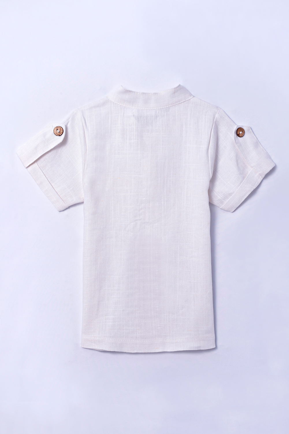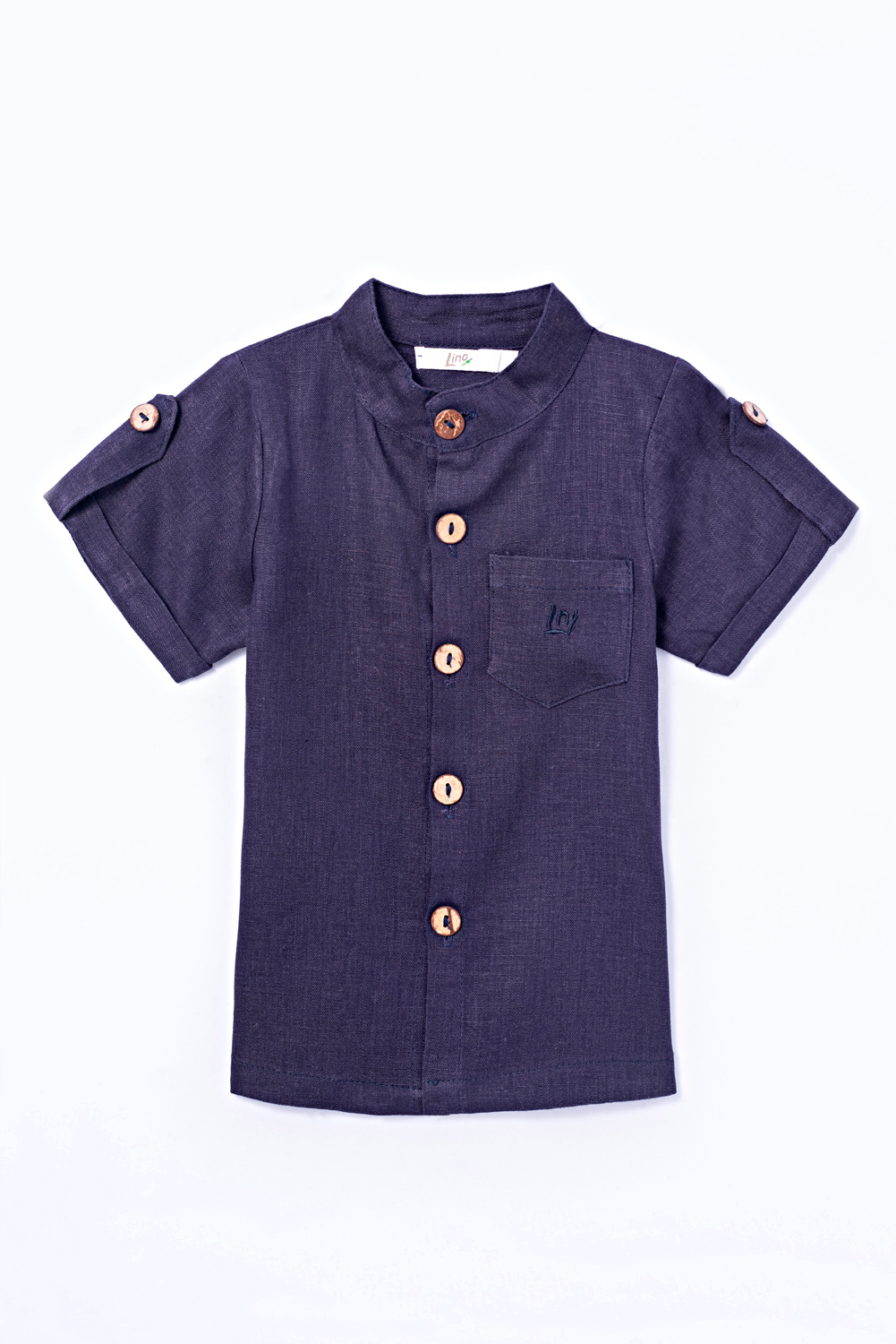 Camisa com manga curta, acabamento com dobra italiana e lapela com botão decorativo. Gola padre. Botões com abertura e bolso na parte da frente. Tecido de linho.