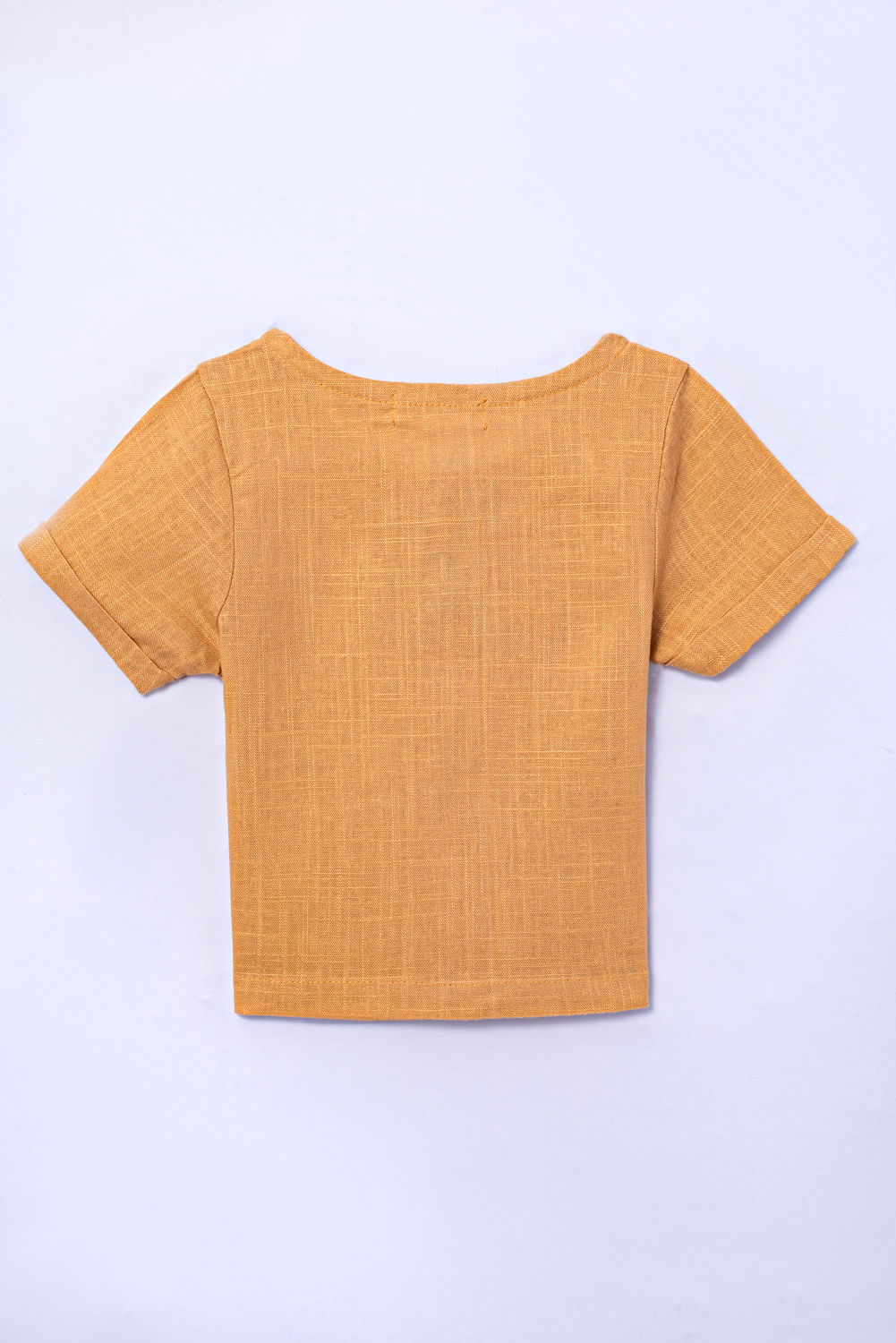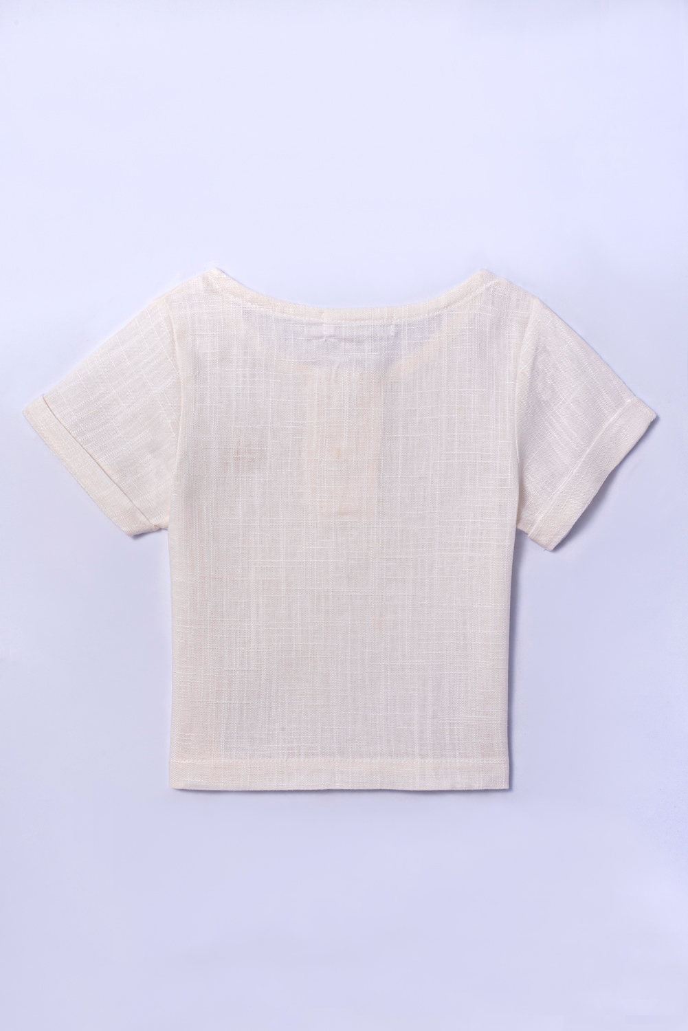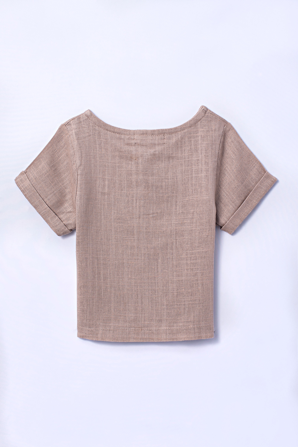 Camiseta com manga curta e acabamento com dobra italiana. Abertura superior com botões. Tecido de linho.