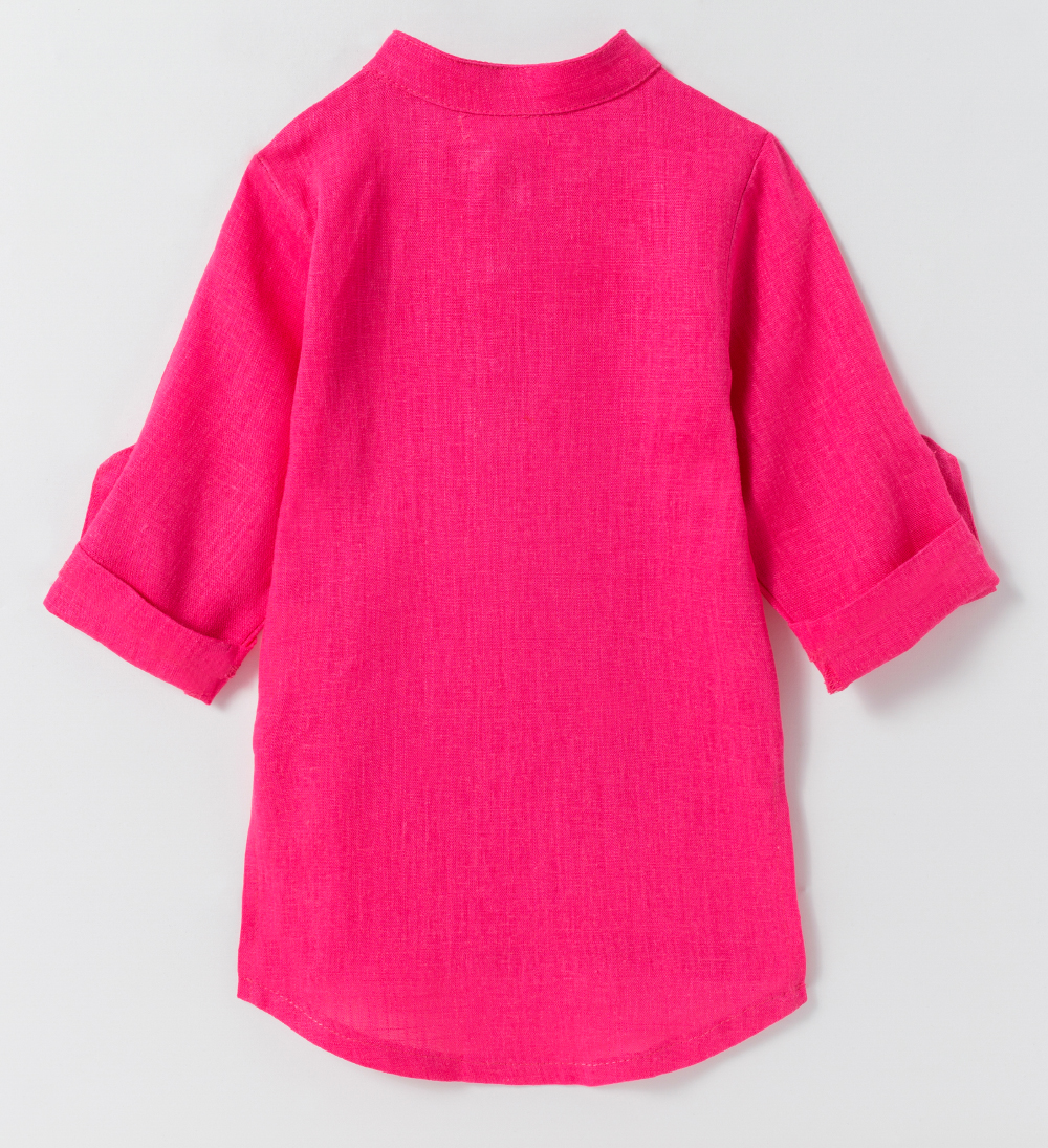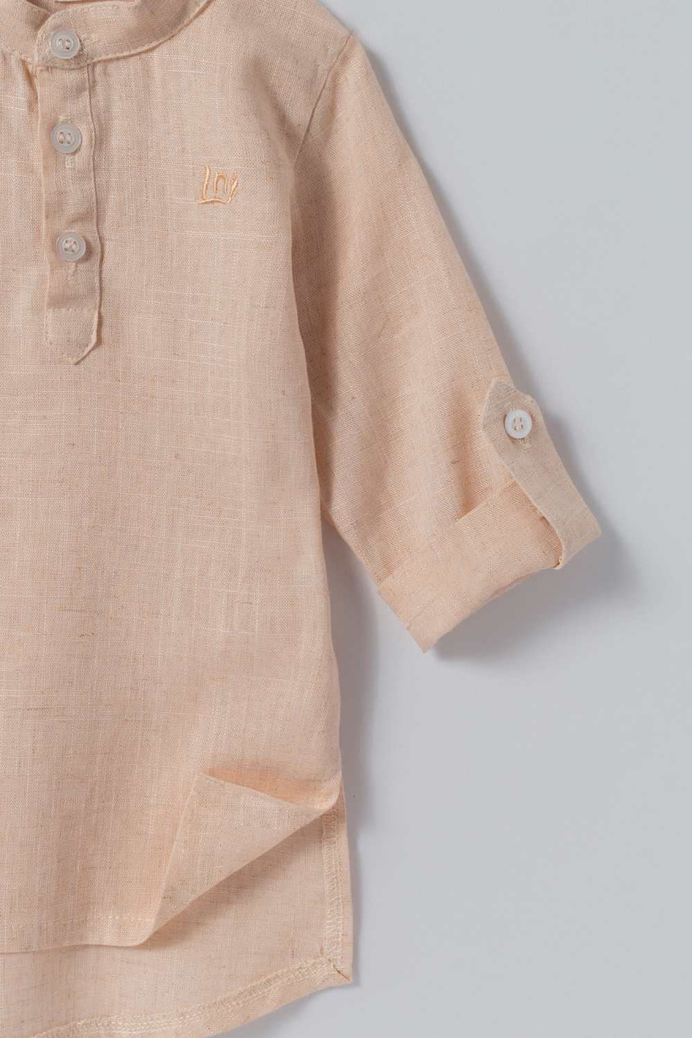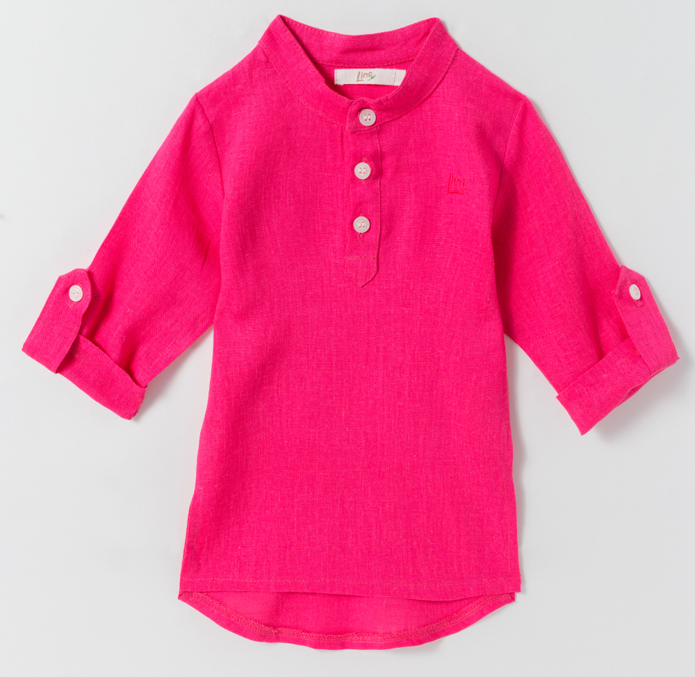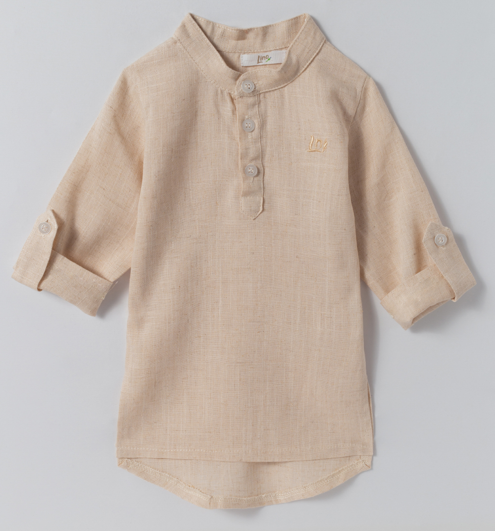 Chemise com manga longa e ajustável com botão. Gola padre. Fechamento com botões na parte da frente. Tecido de linho.