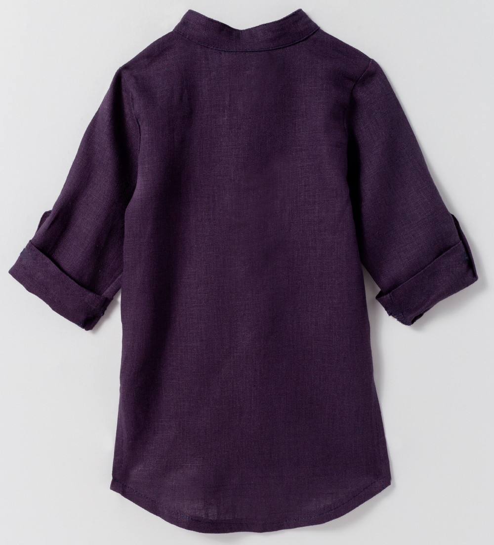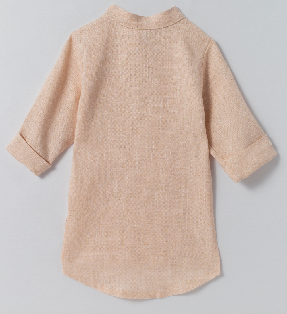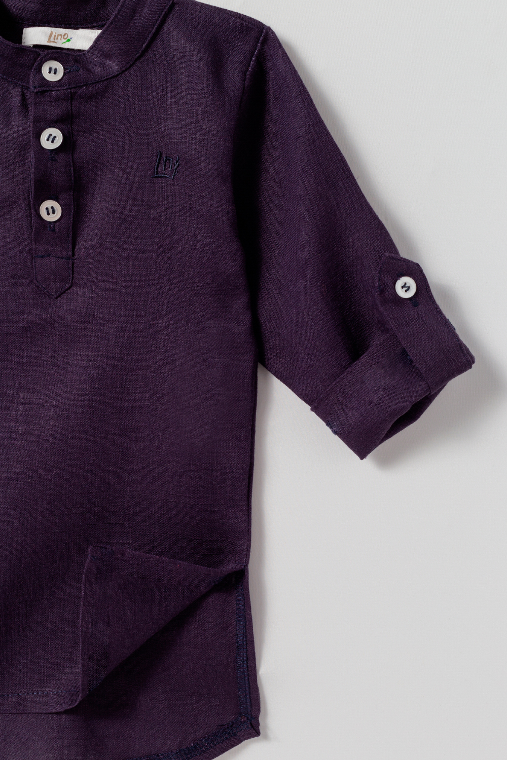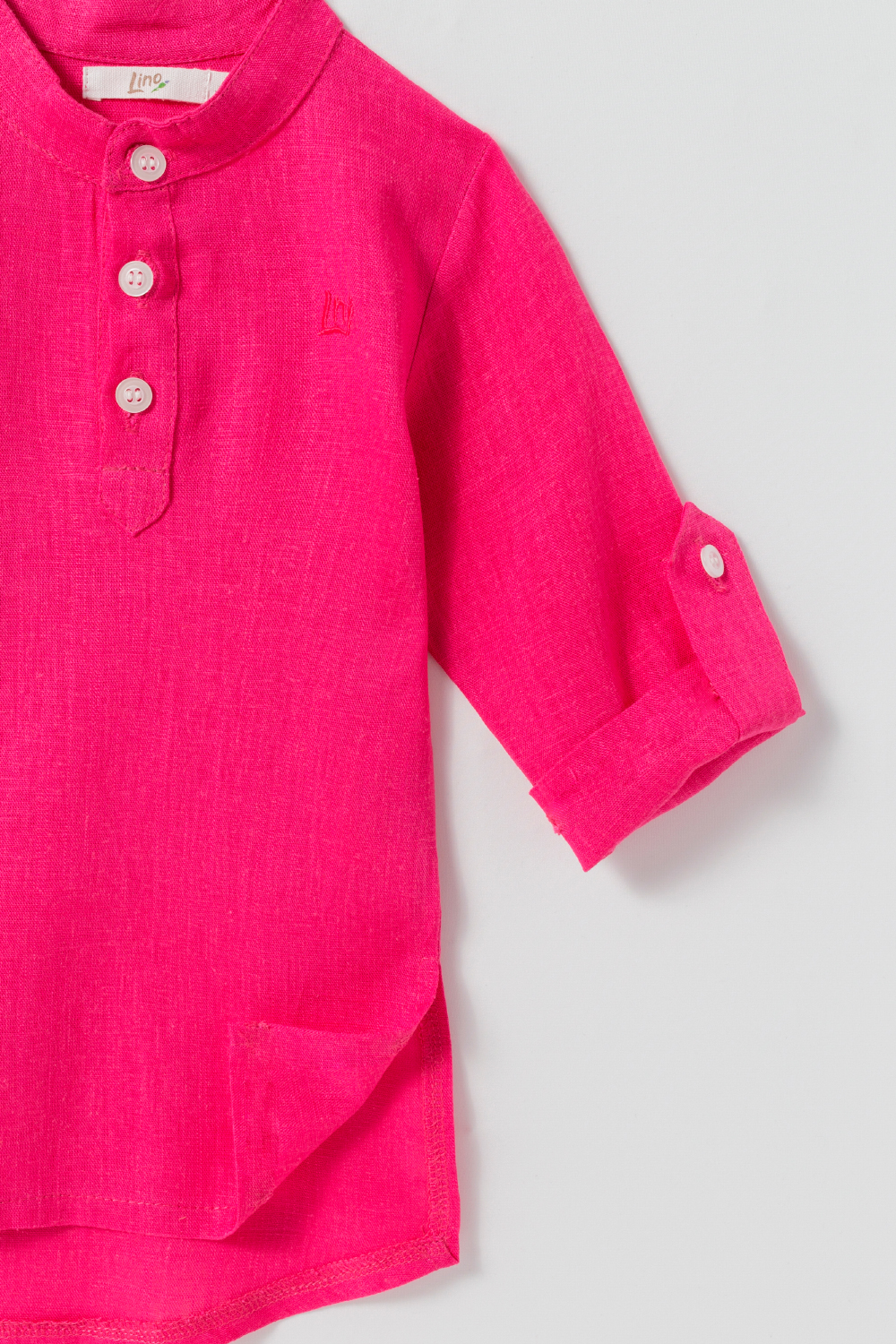 Chemise com manga longa e ajustável com botão. Gola padre. Fechamento com botões na parte da frente. Tecido de linho.