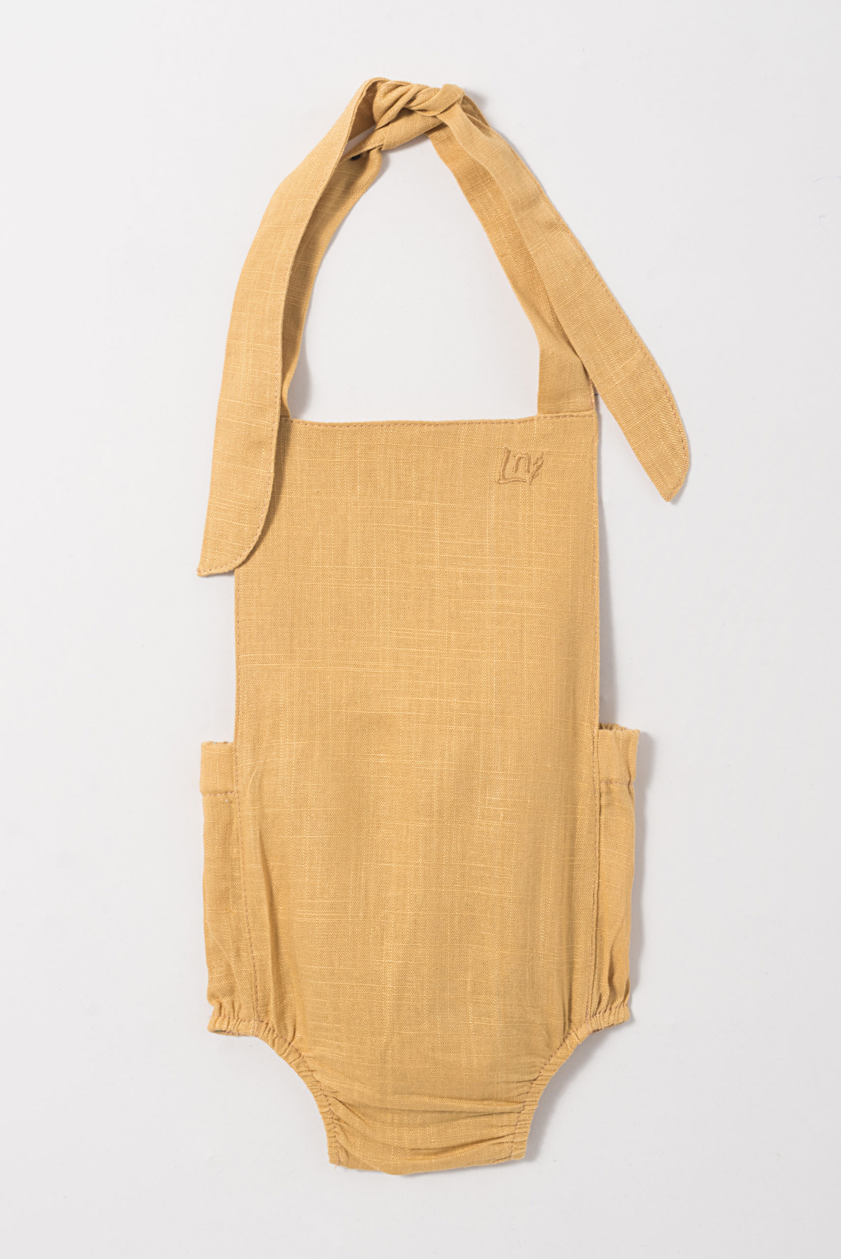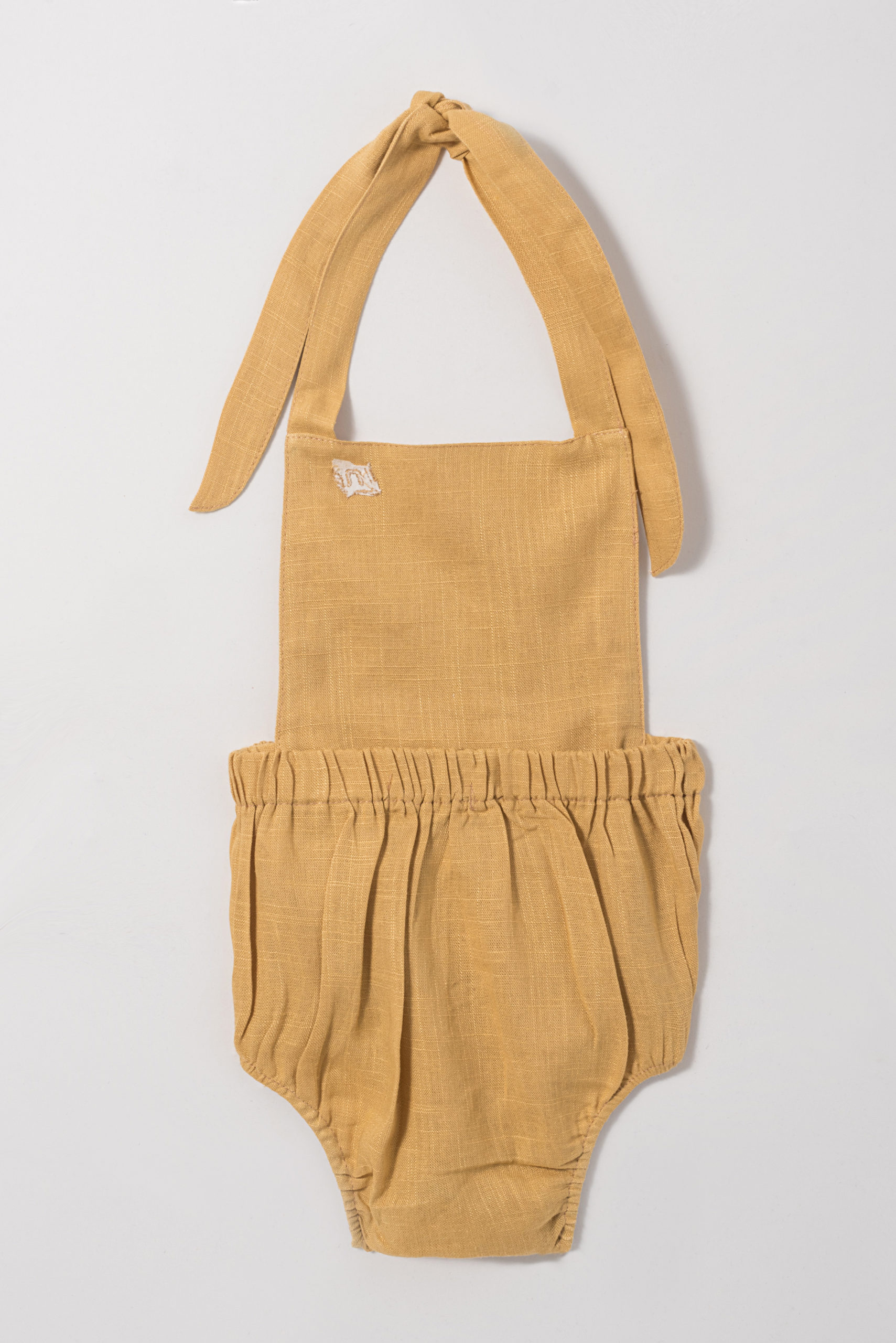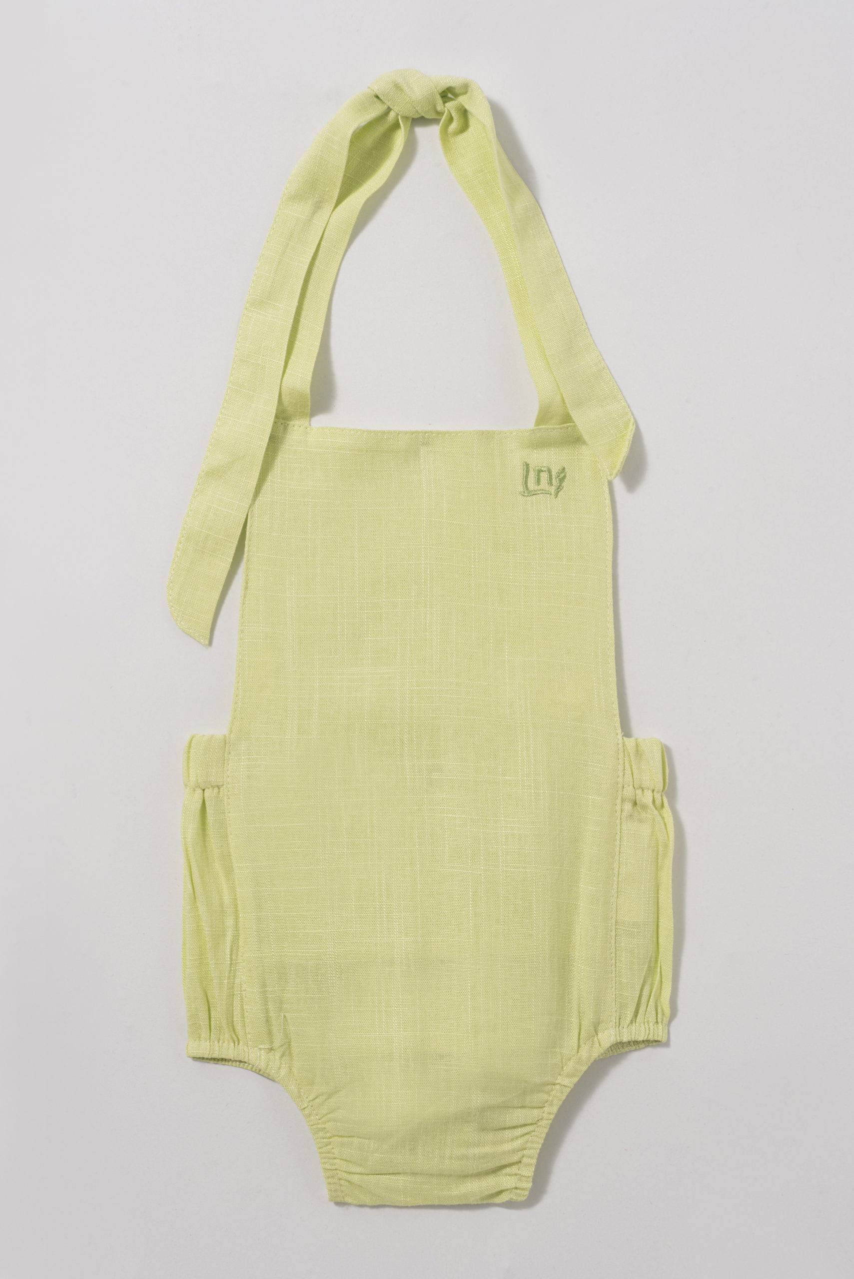 Jardineira com tecido duplo até a cintura. Acabamento pespontado. Elástico na parte de trás da cintura. Acabamento com alças para amarração e ajuste das alças superiores. Fechamento entrepernas em botões de pressão. Tecido de linho.