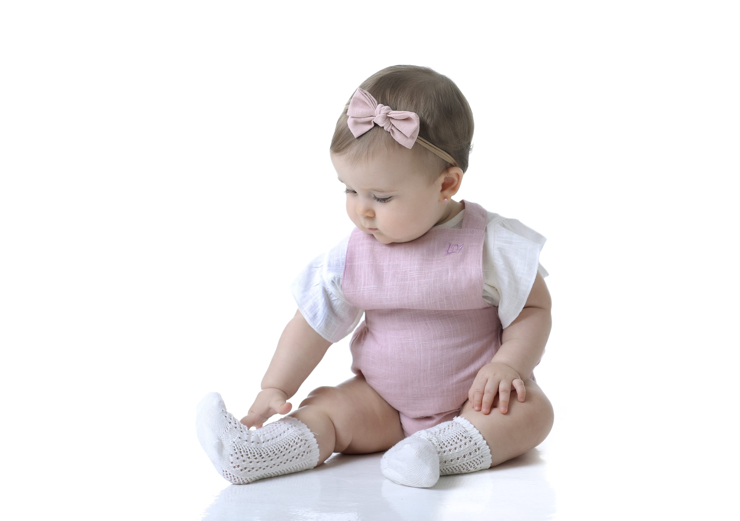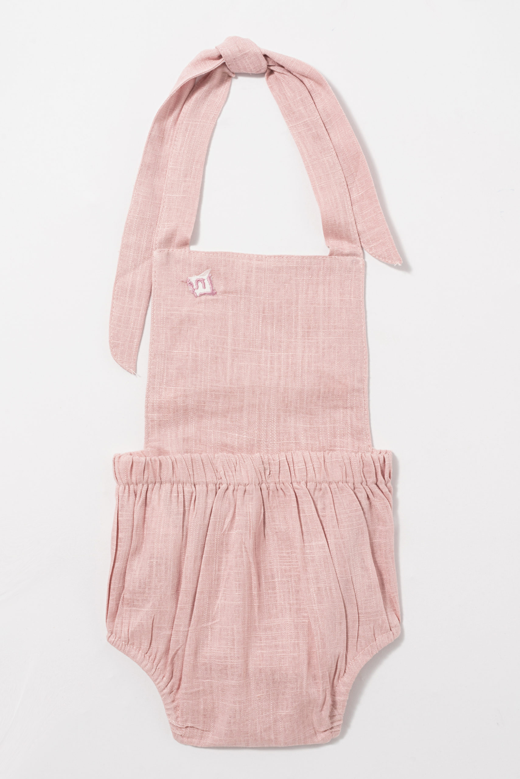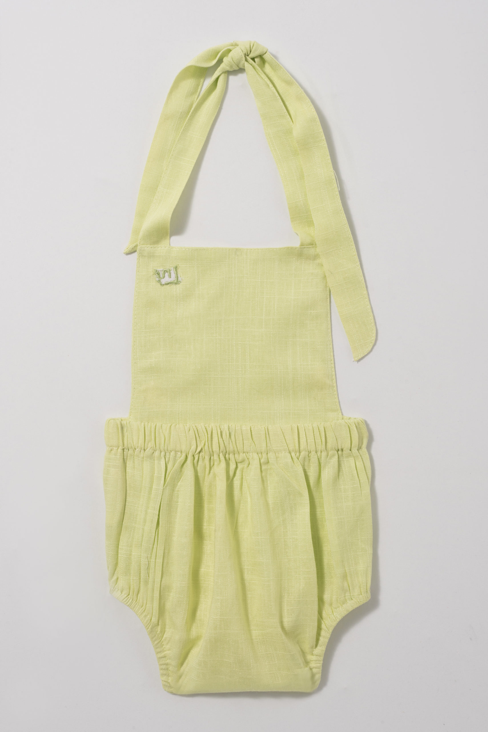 Jardineira com tecido duplo até a cintura. Acabamento pespontado. Elástico na parte de trás da cintura. Acabamento com alças para amarração e ajuste das alças superiores. Fechamento entrepernas em botões de pressão. Tecido de linho.