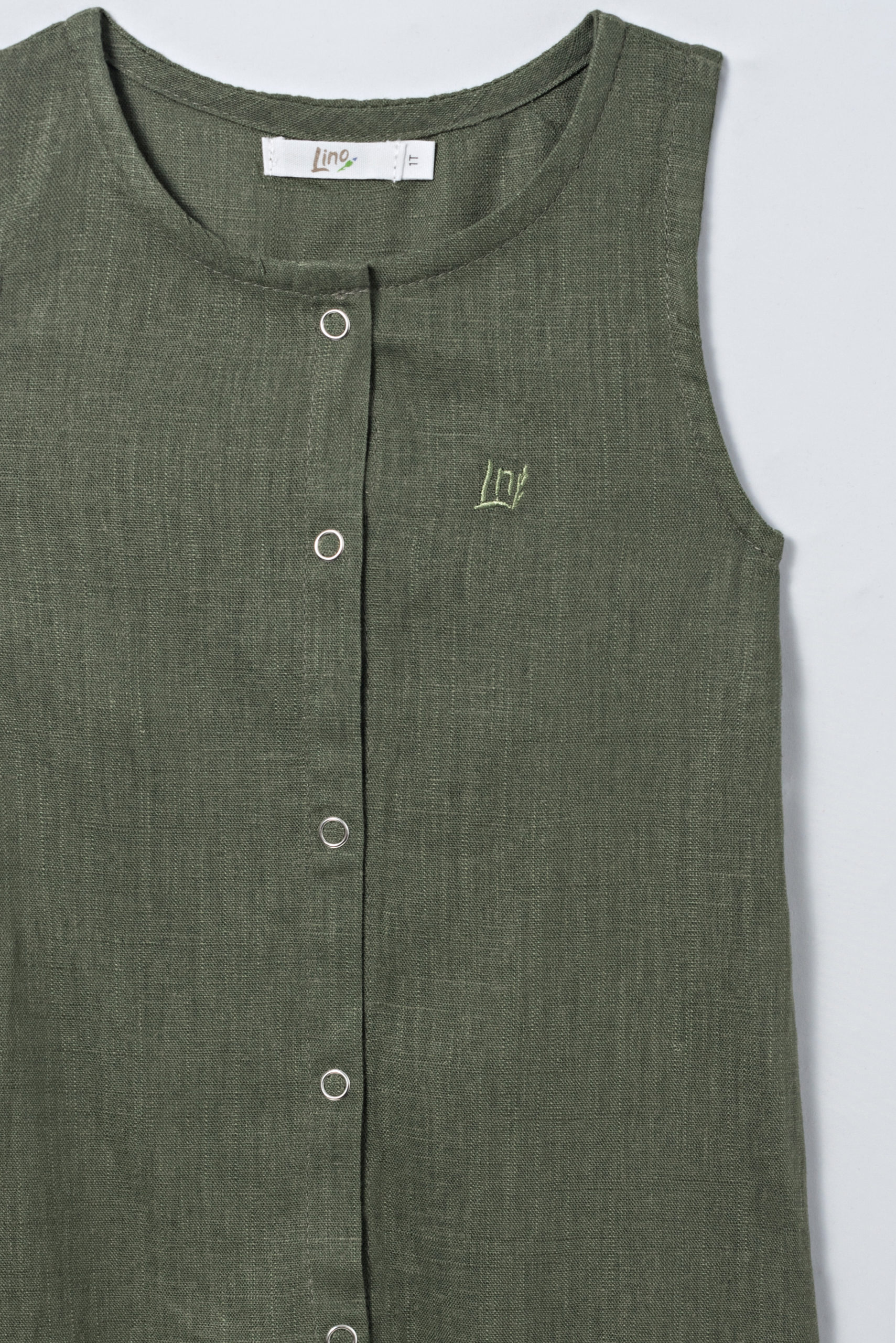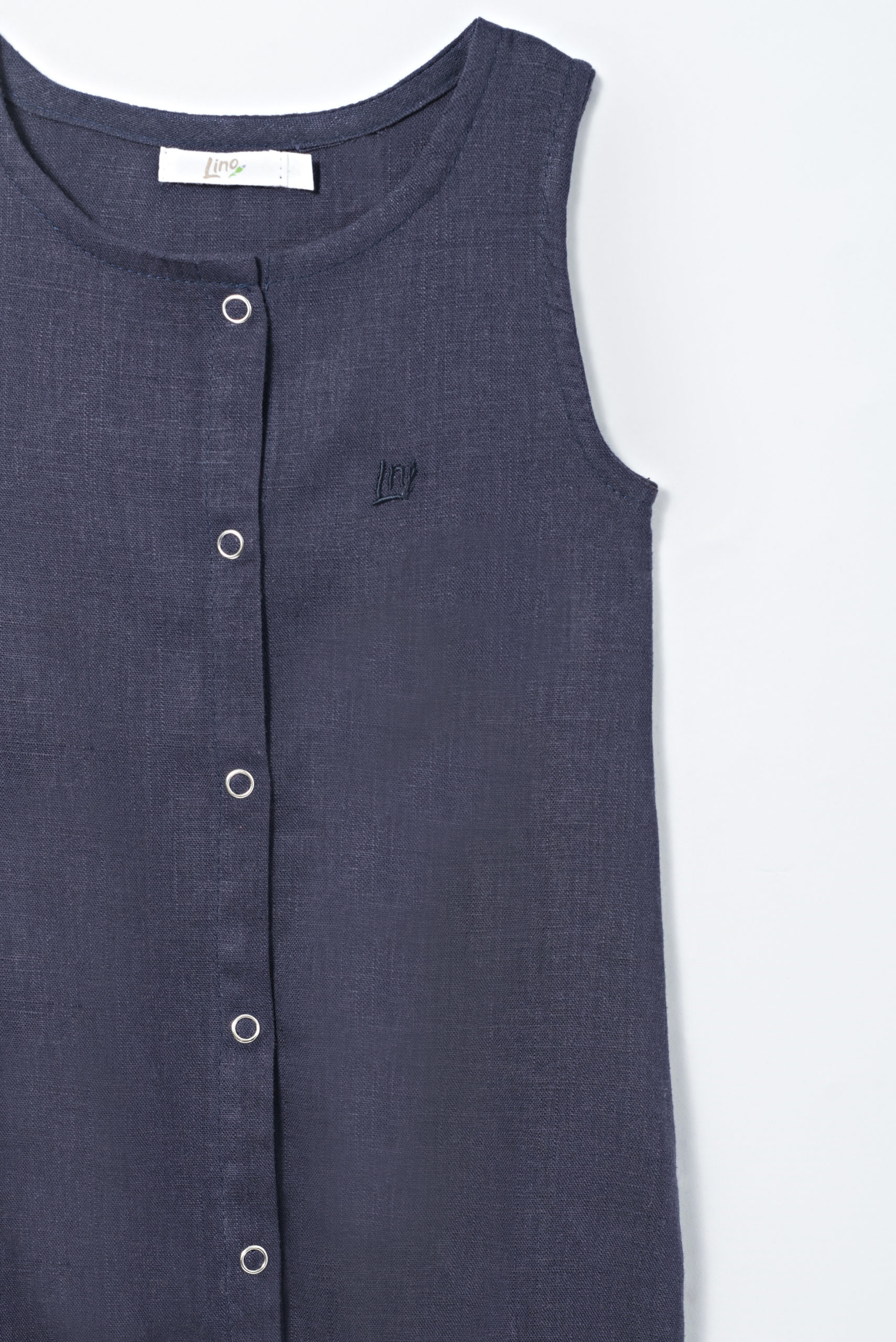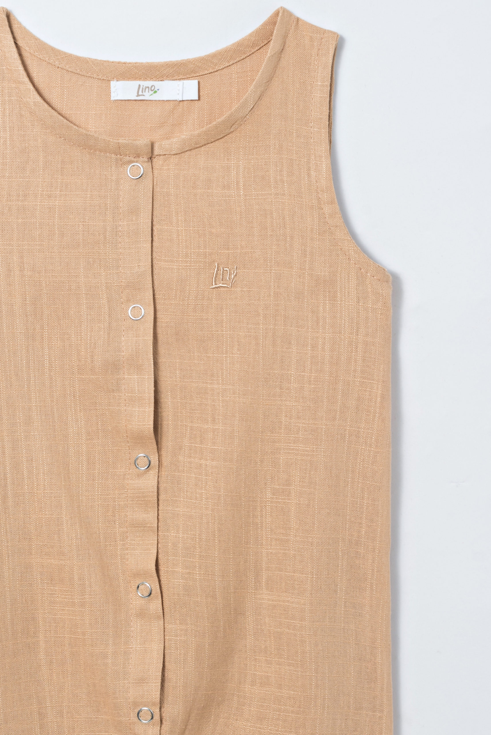 Macacão curto sem mangas com abertura com botões de pressão metálicos na parte da frente. Barra ccom acabamento Italiano. Tecido de linho.