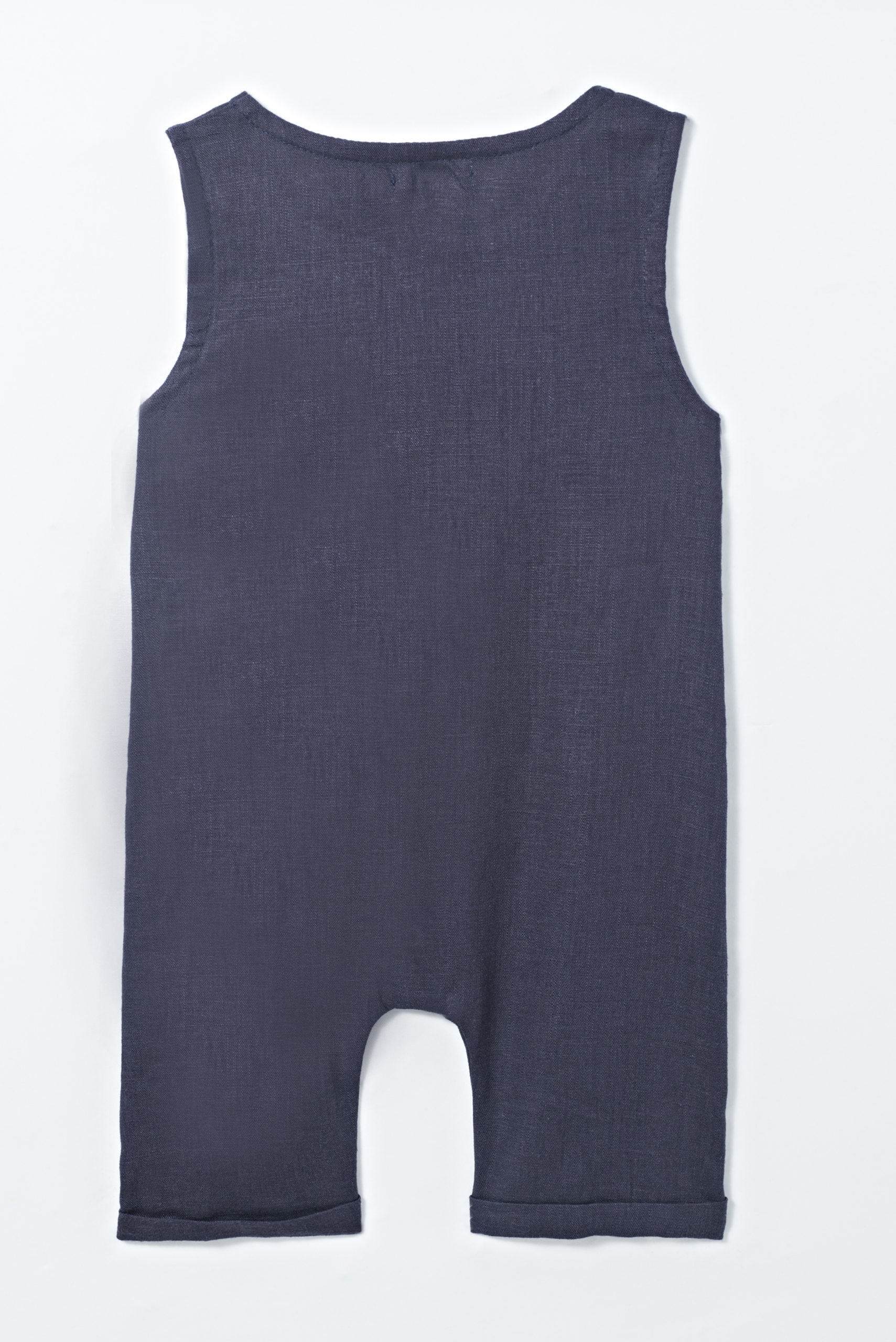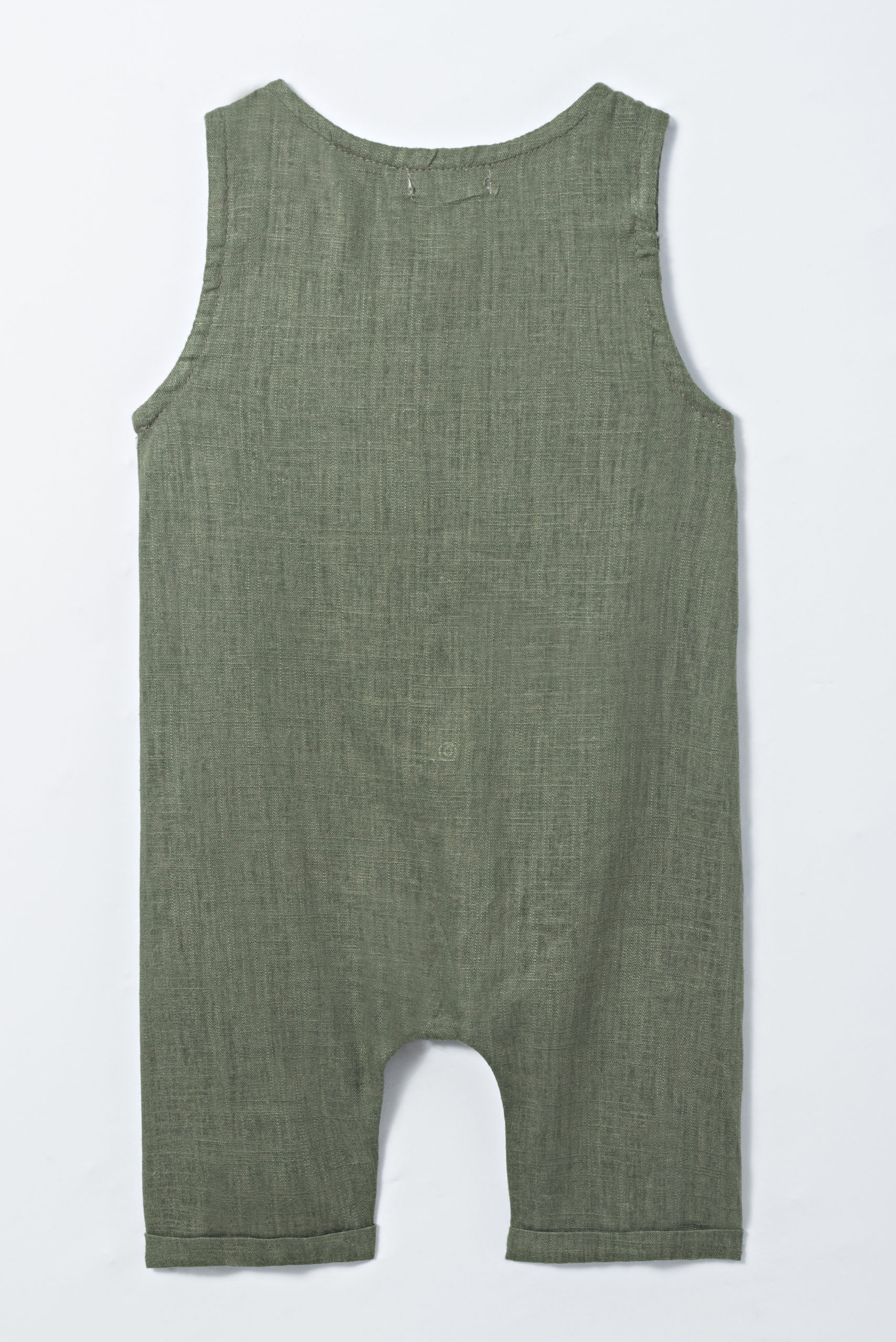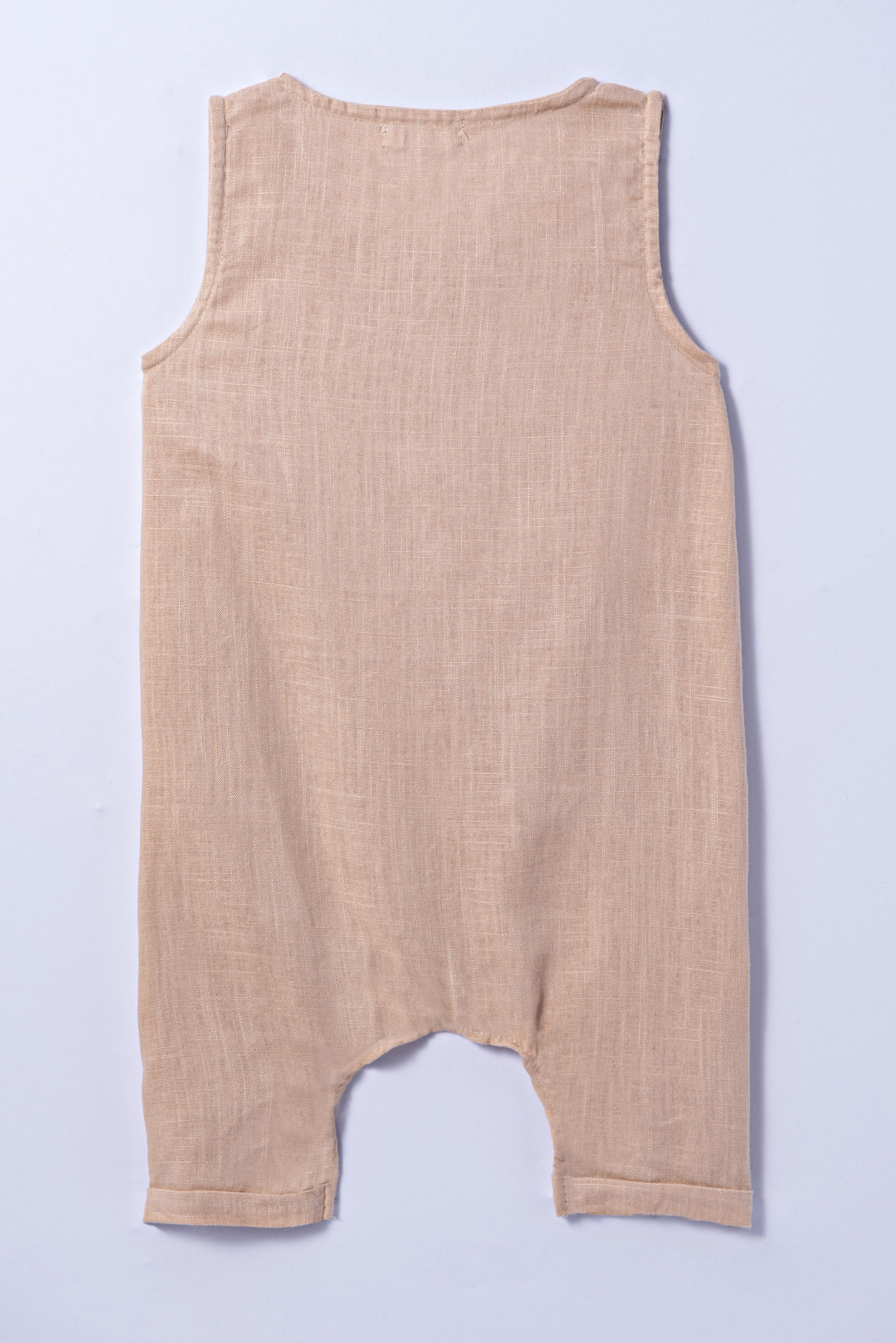 Macacão curto sem mangas com abertura com botões de pressão metálicos na parte da frente. Barra ccom acabamento Italiano. Tecido de linho.