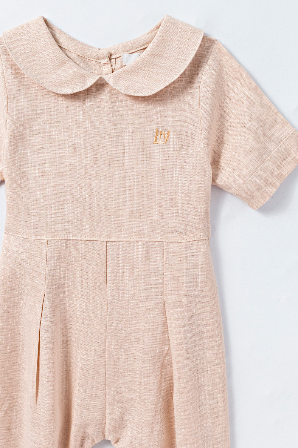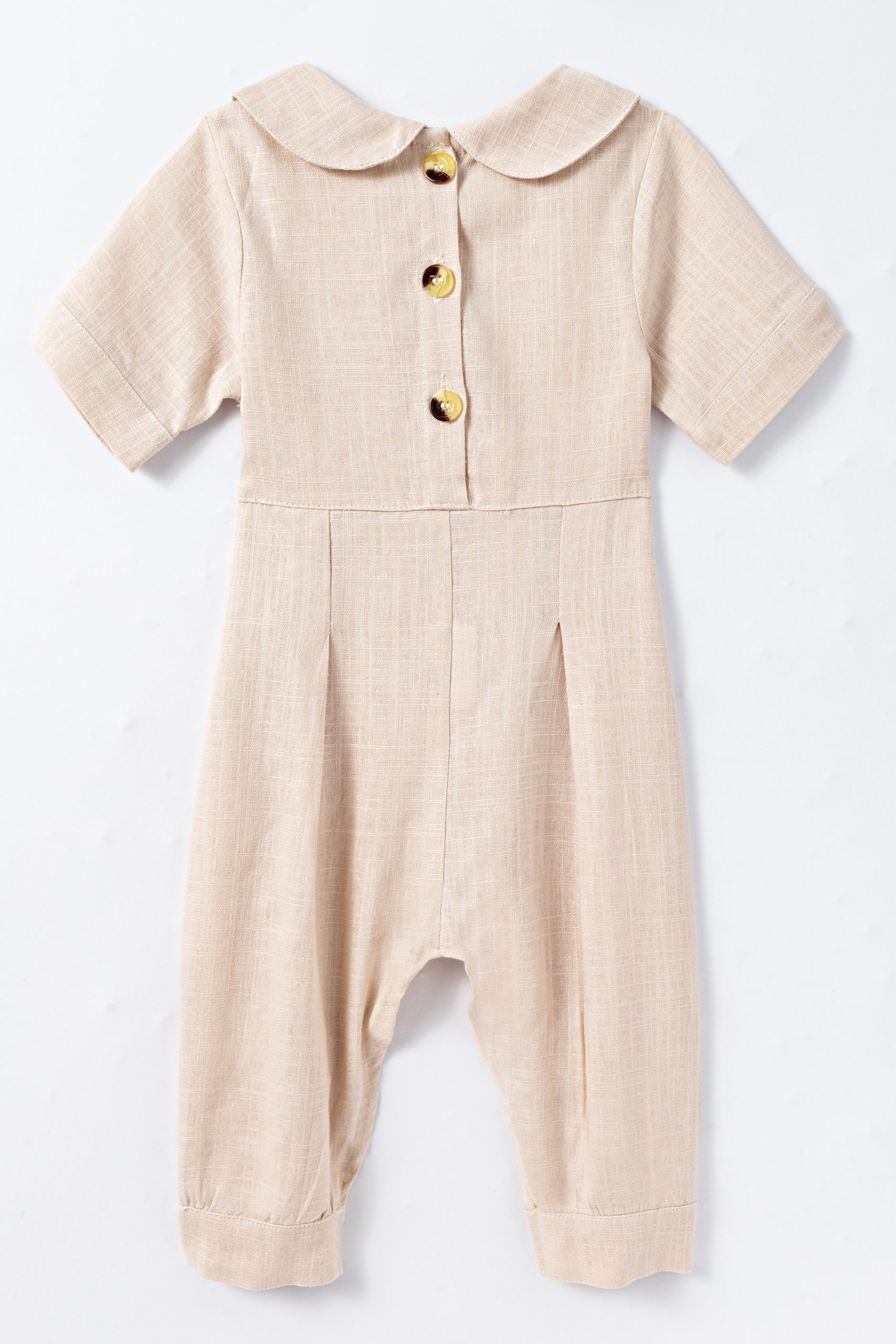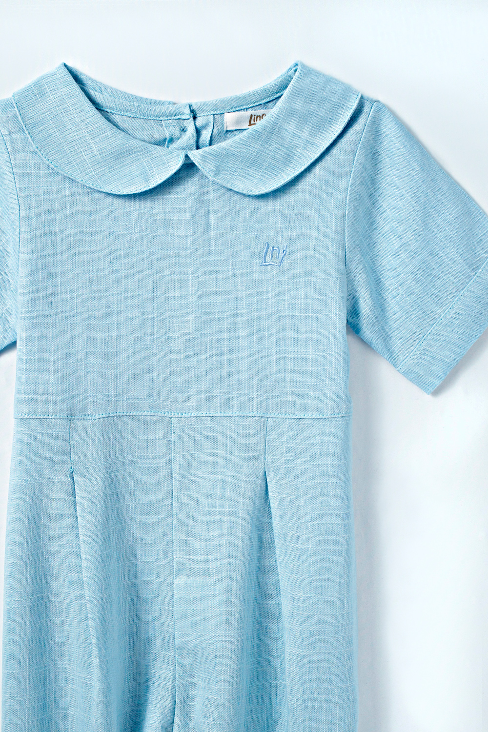 Macacão com mangas curtas e gola Peter Pan. Fechamento em botões na parte de trás. Detalhe pespontado na cintura e pregas. Barra com punho. Tecido de linho.