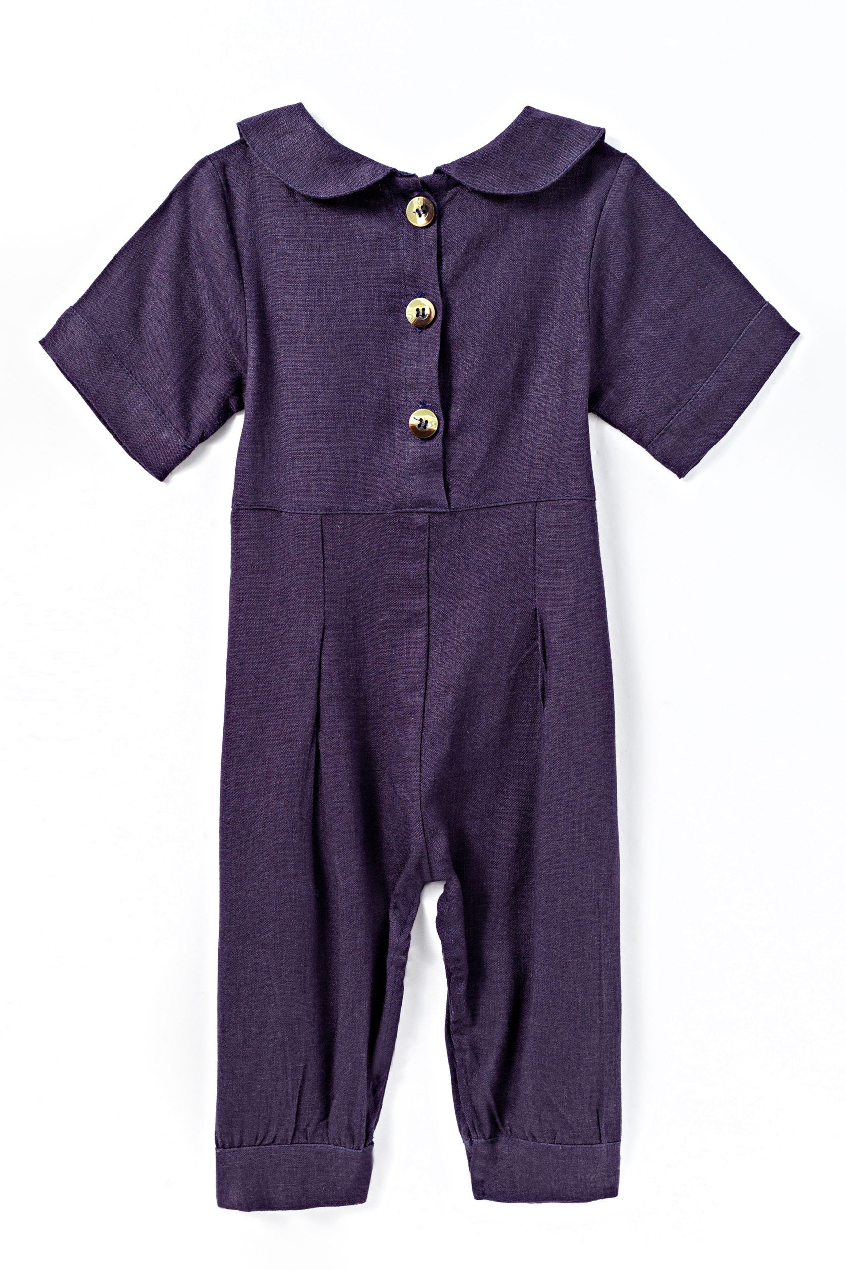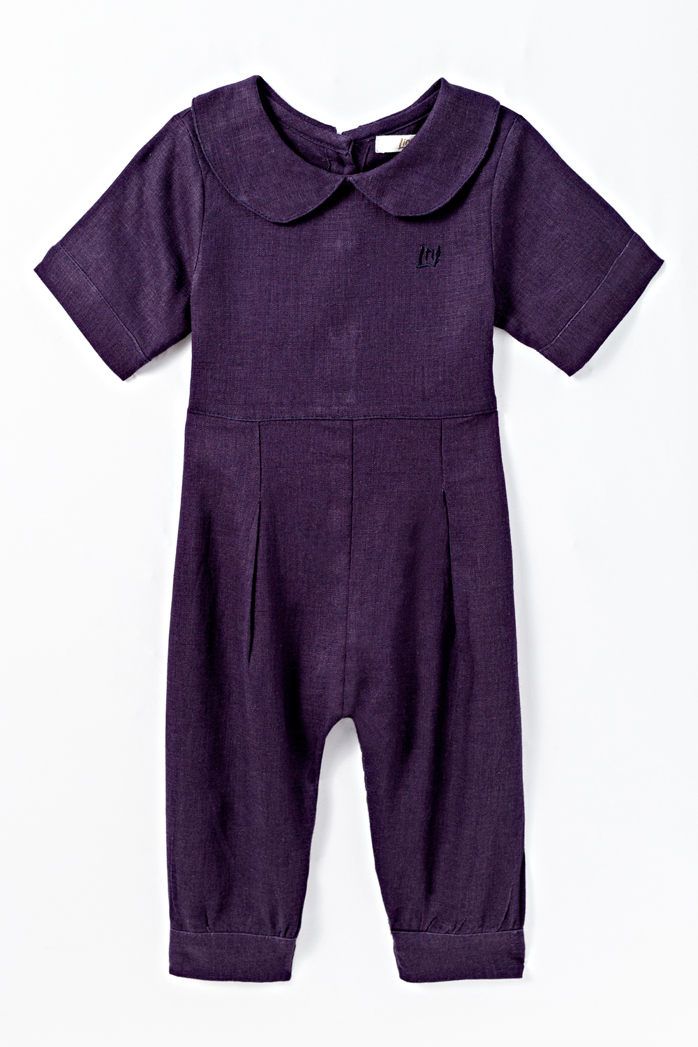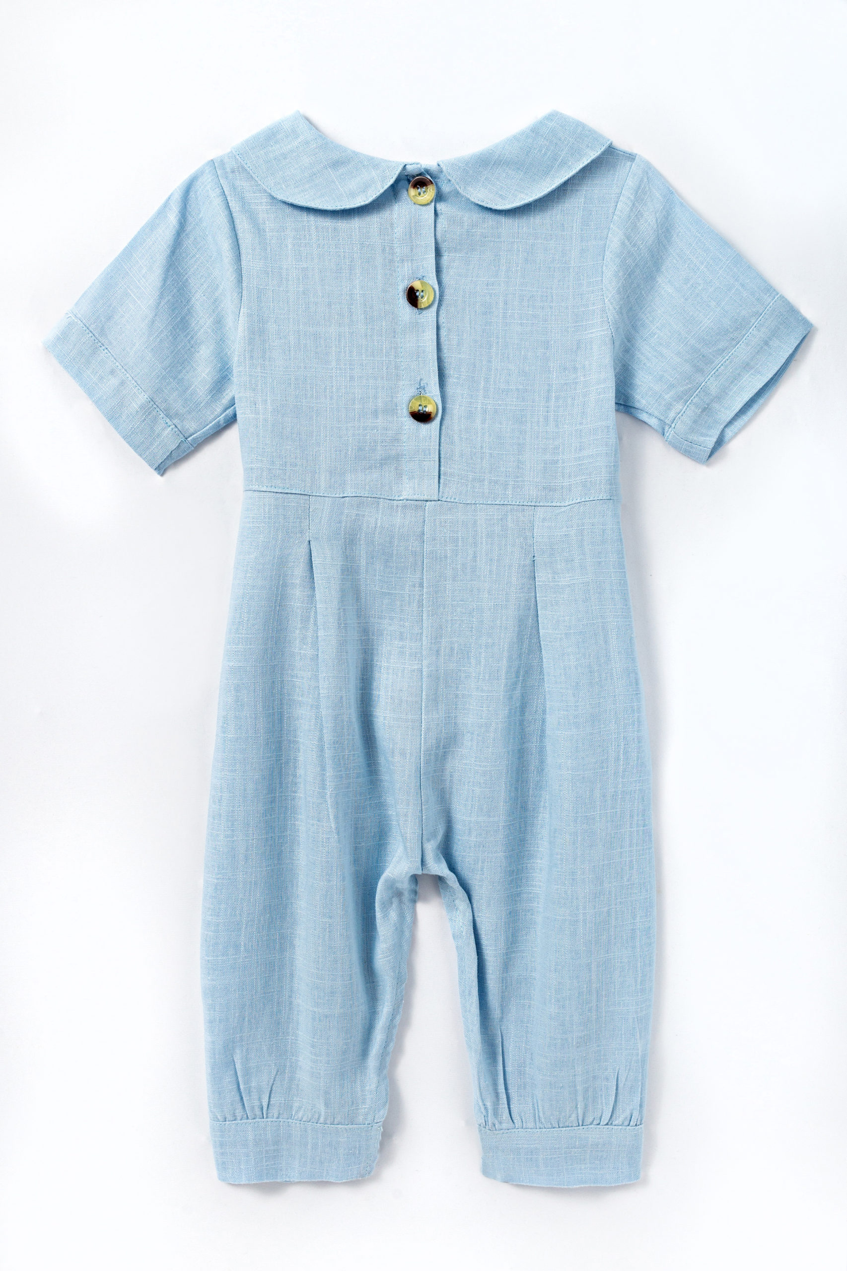 Macacão com mangas curtas e gola Peter Pan. Fechamento em botões na parte de trás. Detalhe pespontado na cintura e pregas. Barra com punho. Tecido de linho.