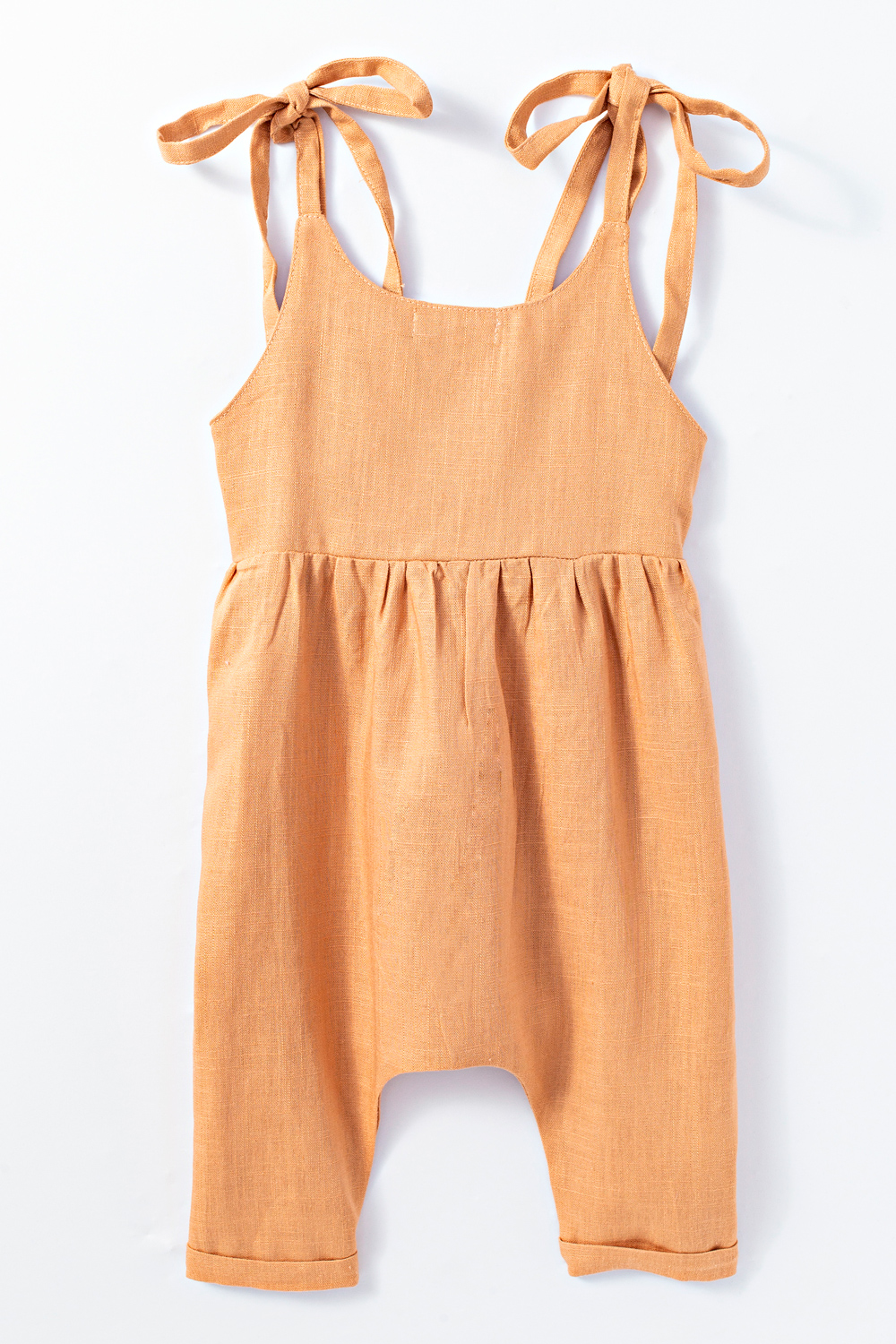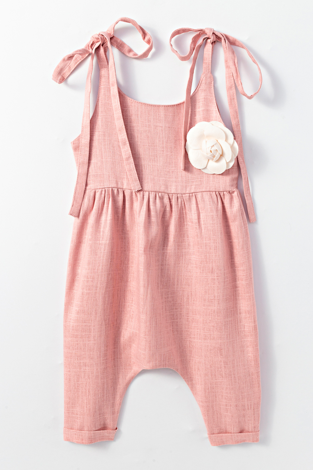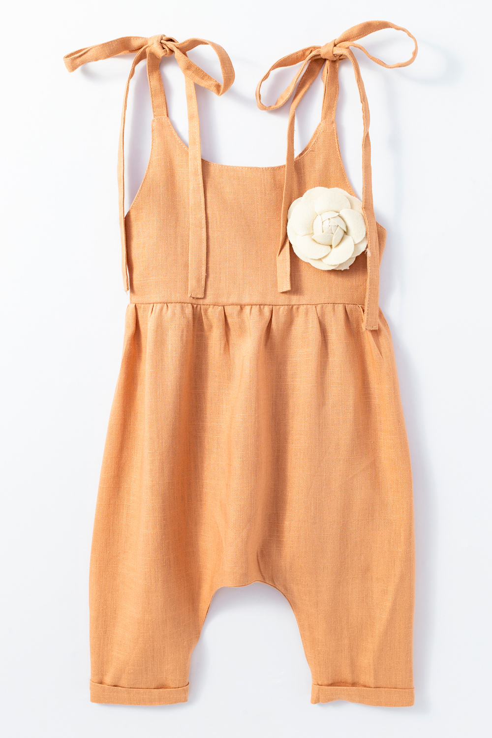 Macacão modelo saruel com tecido duplo na parte da frente e detalhe franzido. Alças de amarrar ajustáveis. Barra com acabamento italiana. Acompanha aplique de flor removível. Tecido de linho.