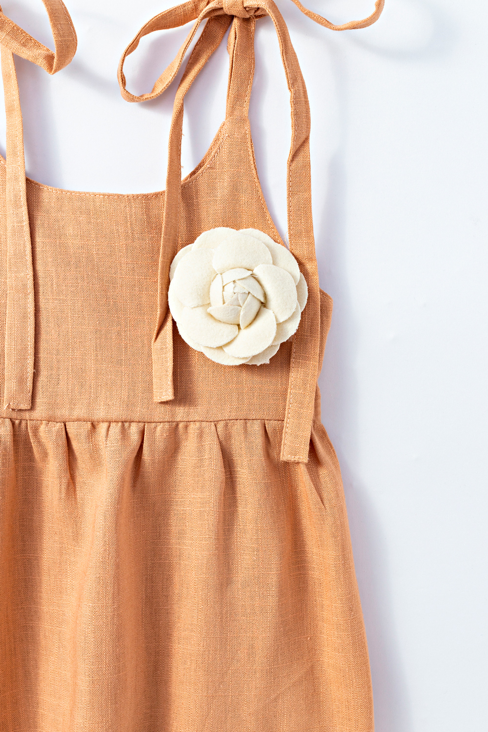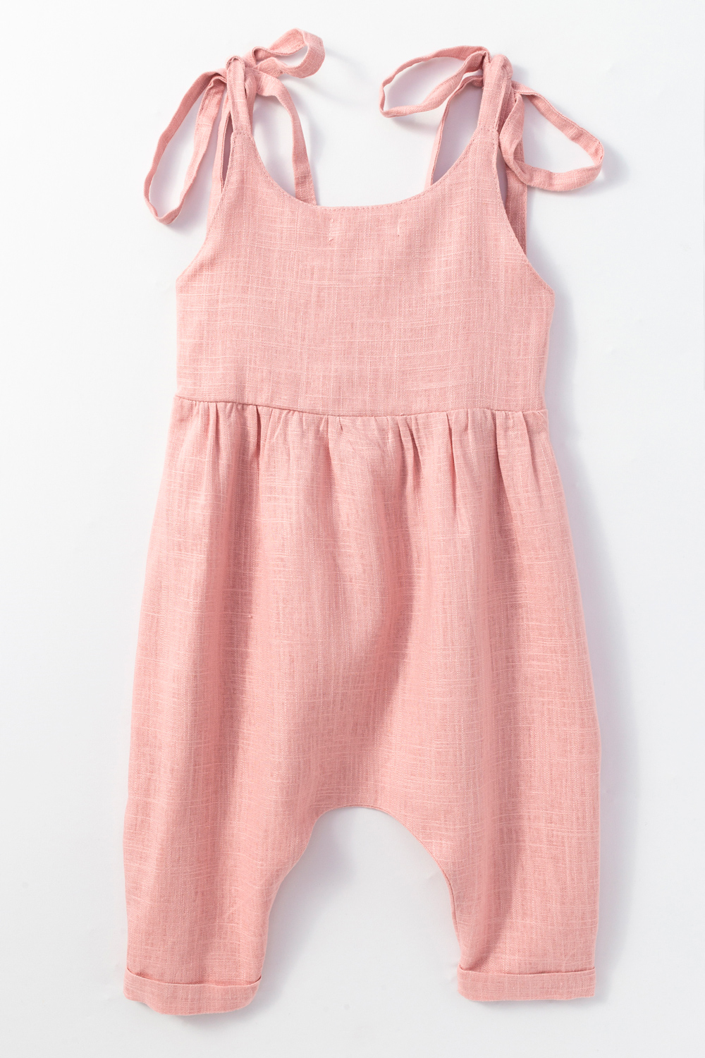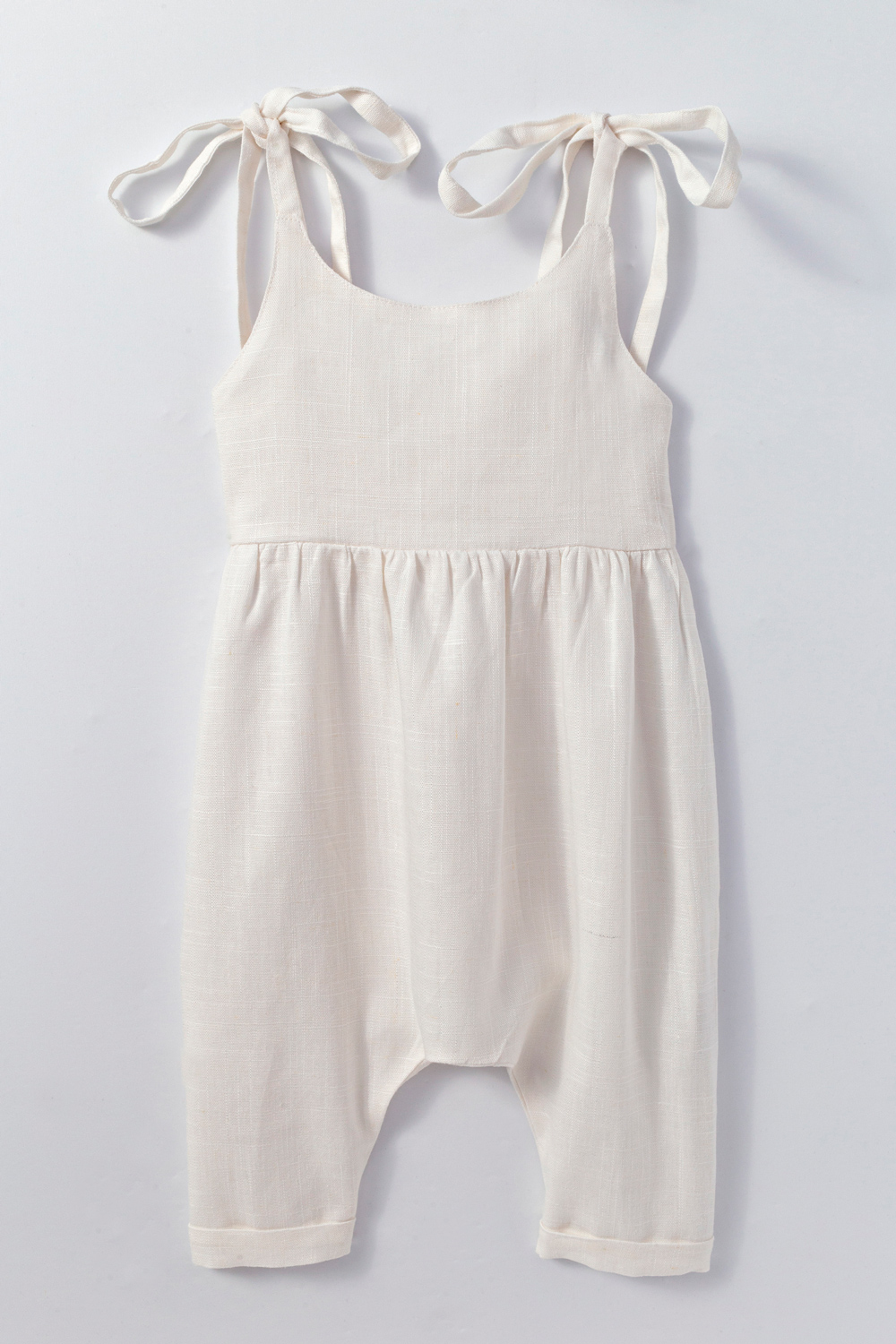 Macacão modelo saruel com tecido duplo na parte da frente e detalhe franzido. Alças de amarrar ajustáveis. Barra com acabamento italiana. Acompanha aplique de flor removível. Tecido de linho.