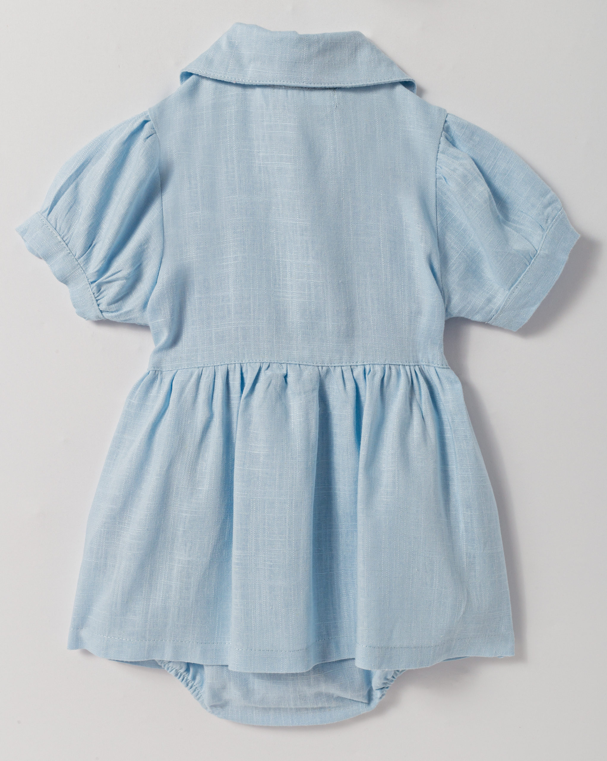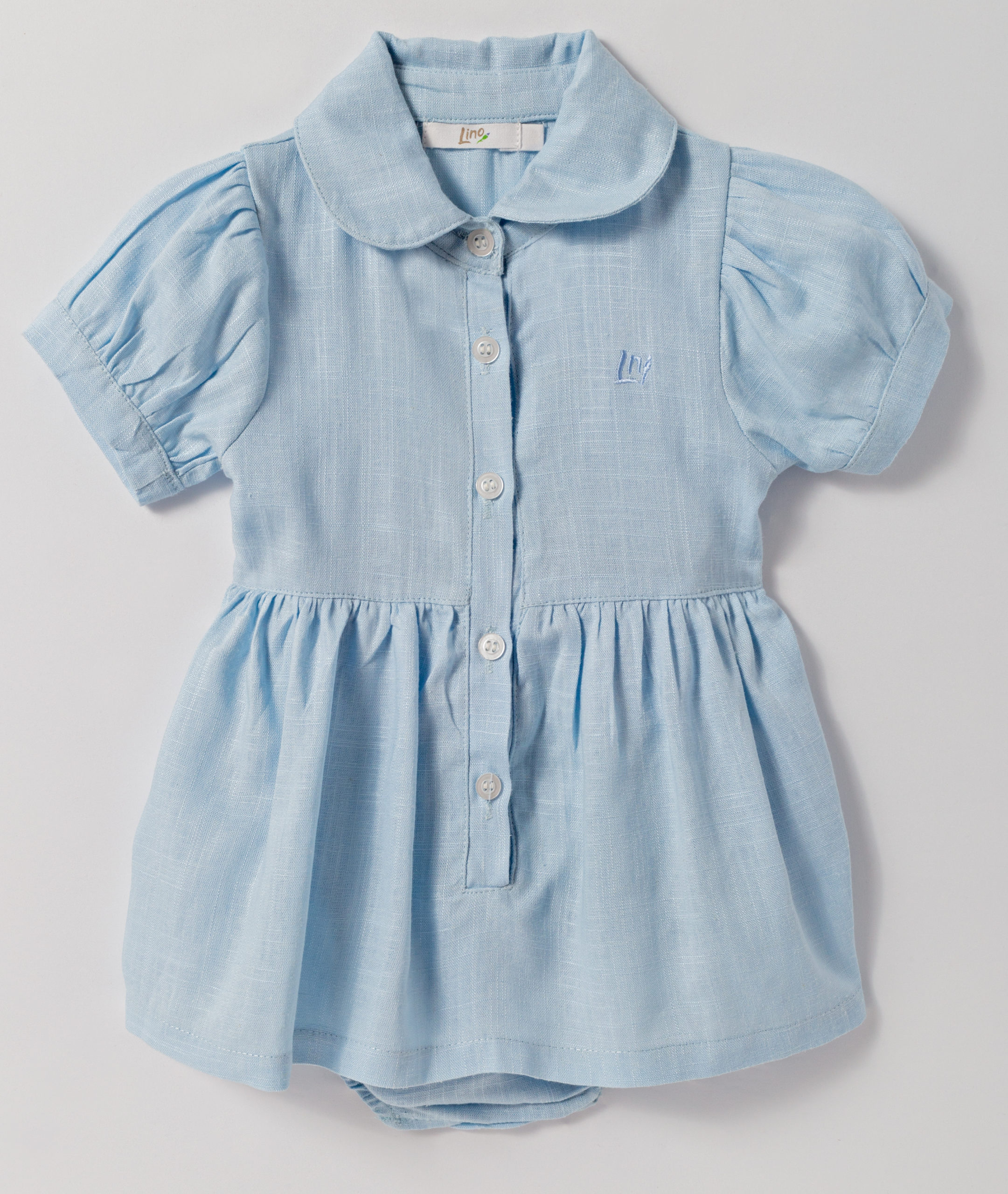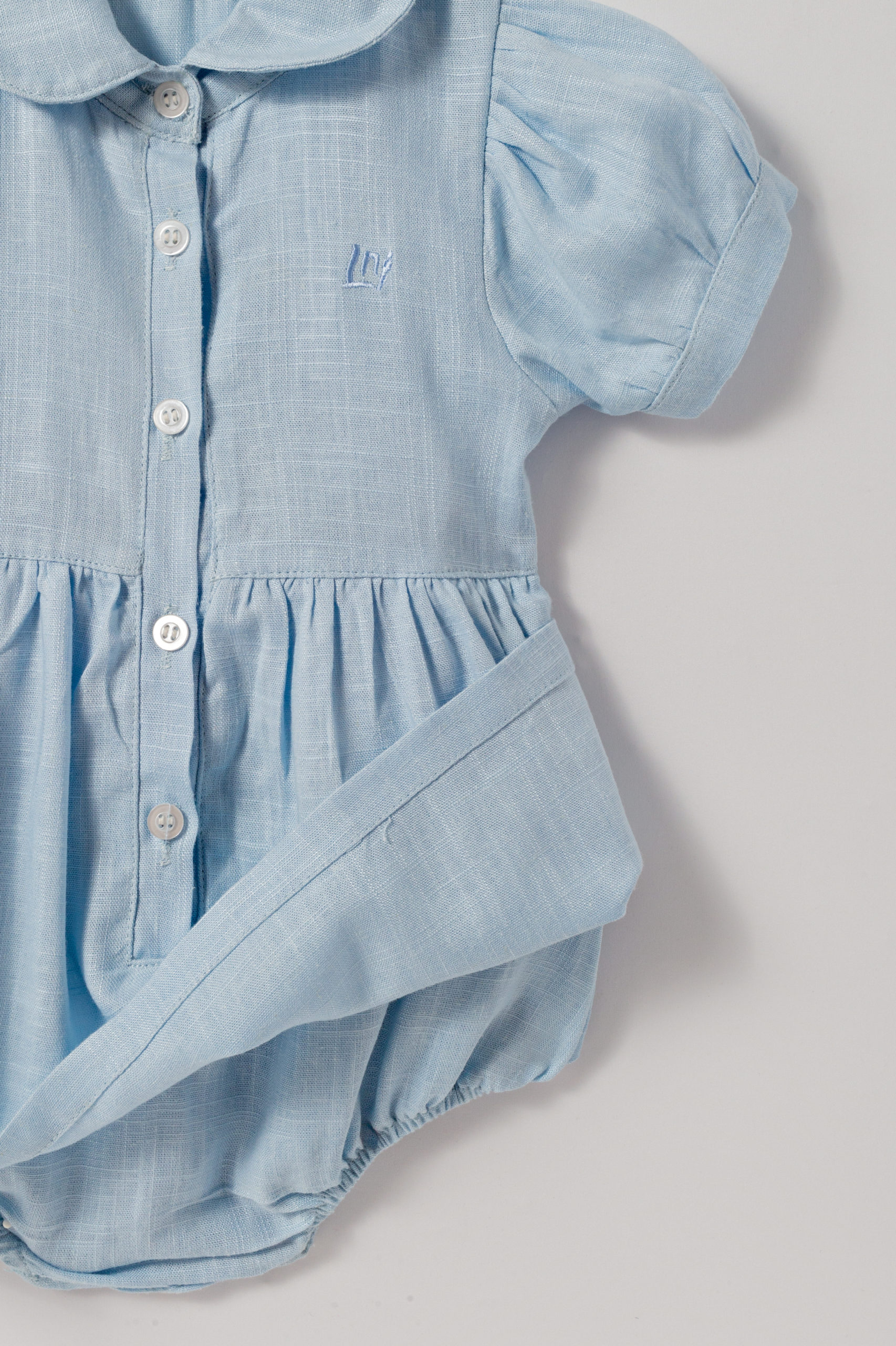 Vestido body com manga curta e bufante. Gola boneca pespontada e detalhe franzido na parte da cintura. Vista com abotoamento na frente e calcinha embutida com fechamento em botões. Tecido de linho.