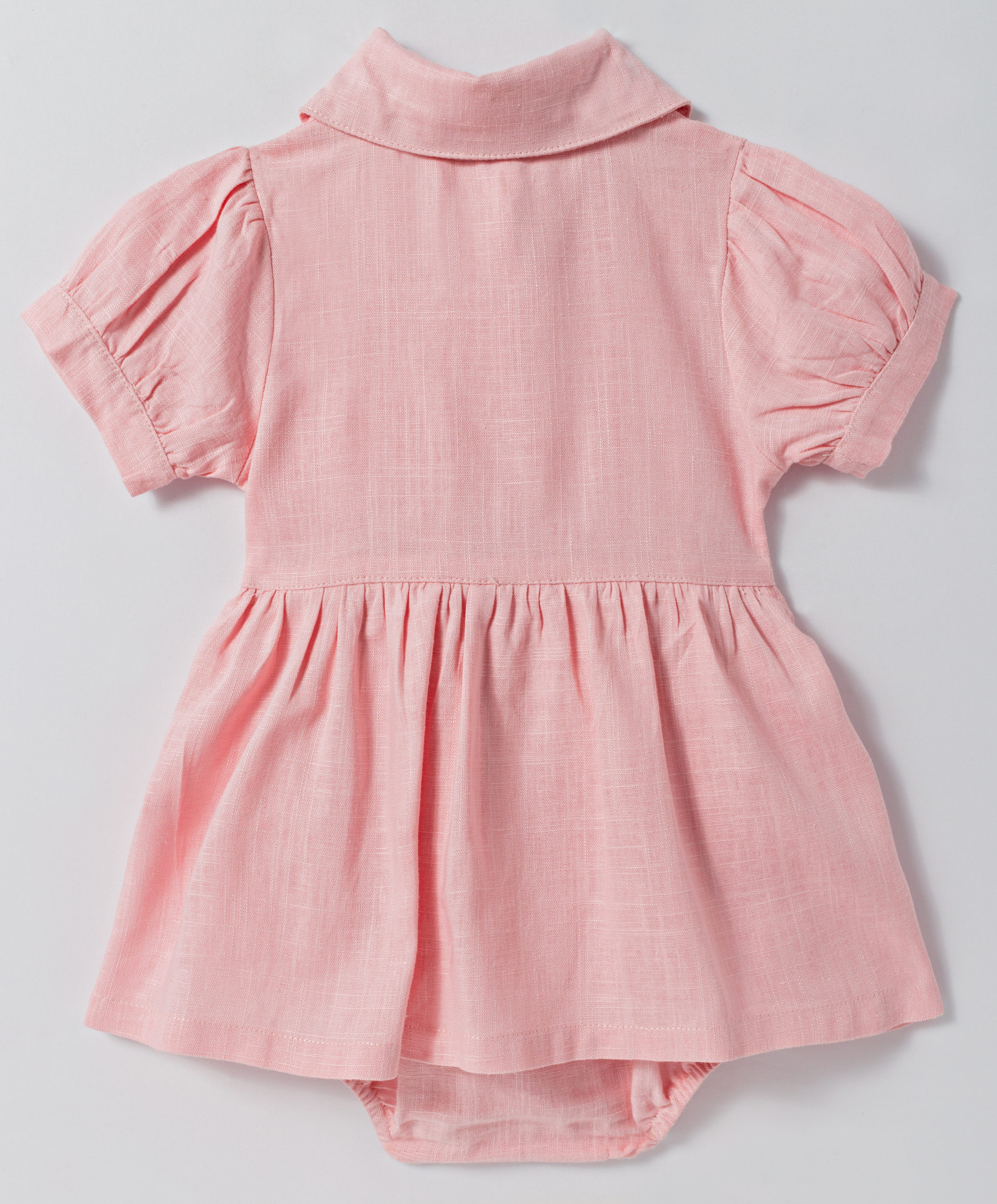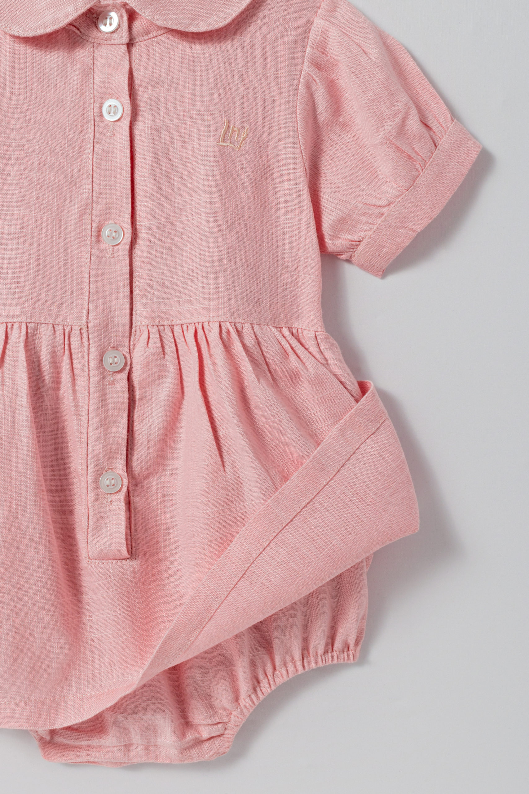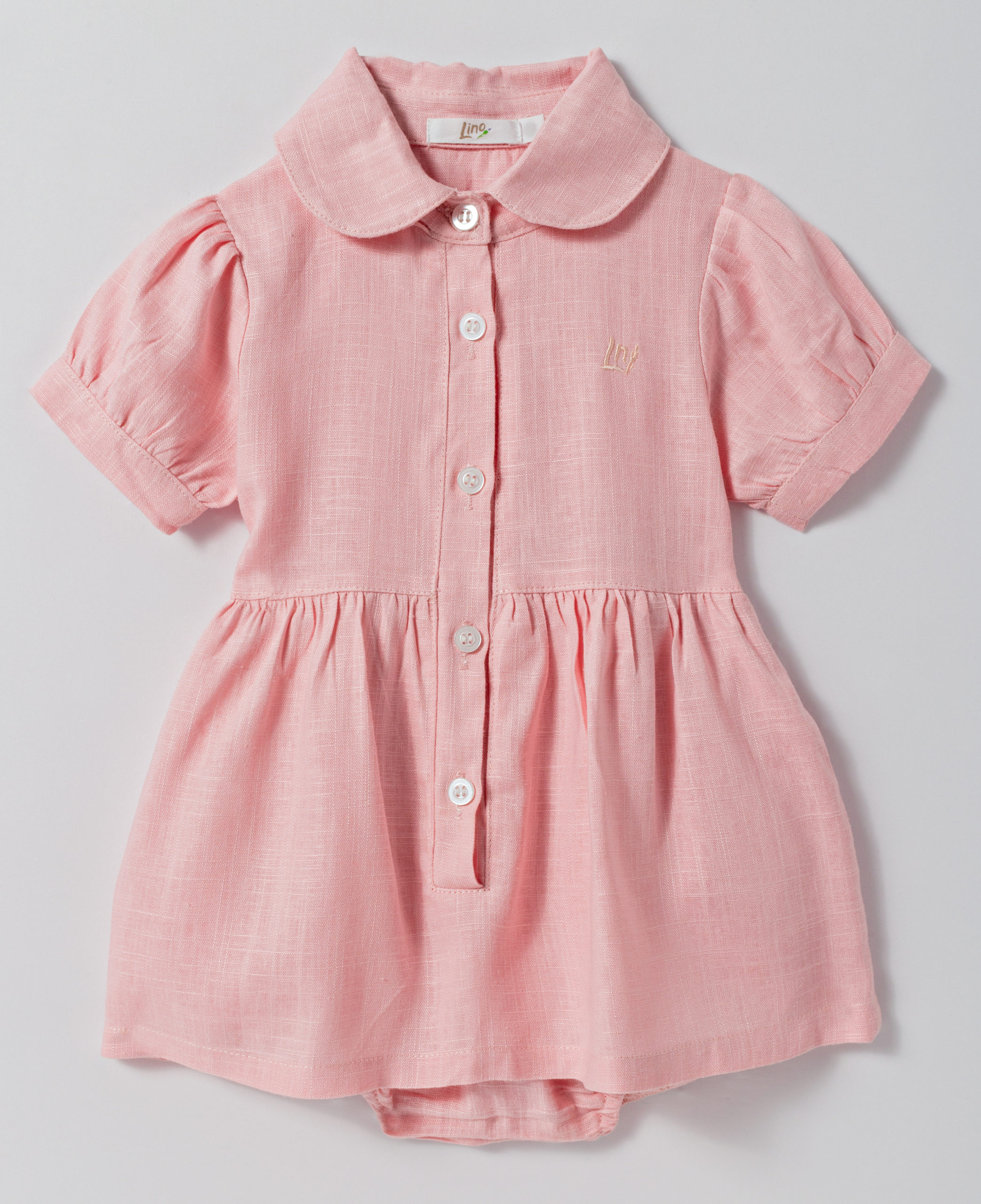 Vestido body com manga curta e bufante. Gola boneca pespontada e detalhe franzido na parte da cintura. Vista com abotoamento na frente e calcinha embutida com fechamento em botões. Tecido de linho.