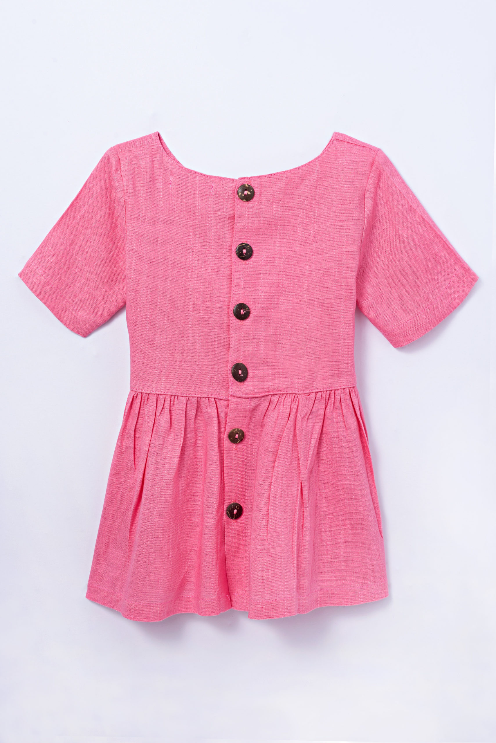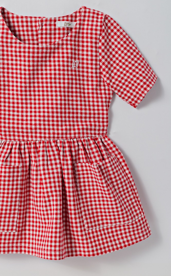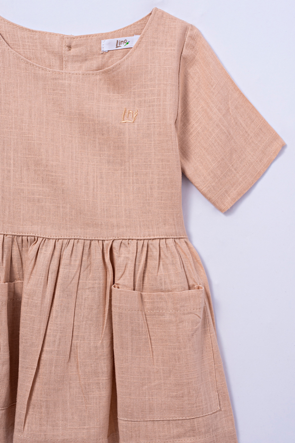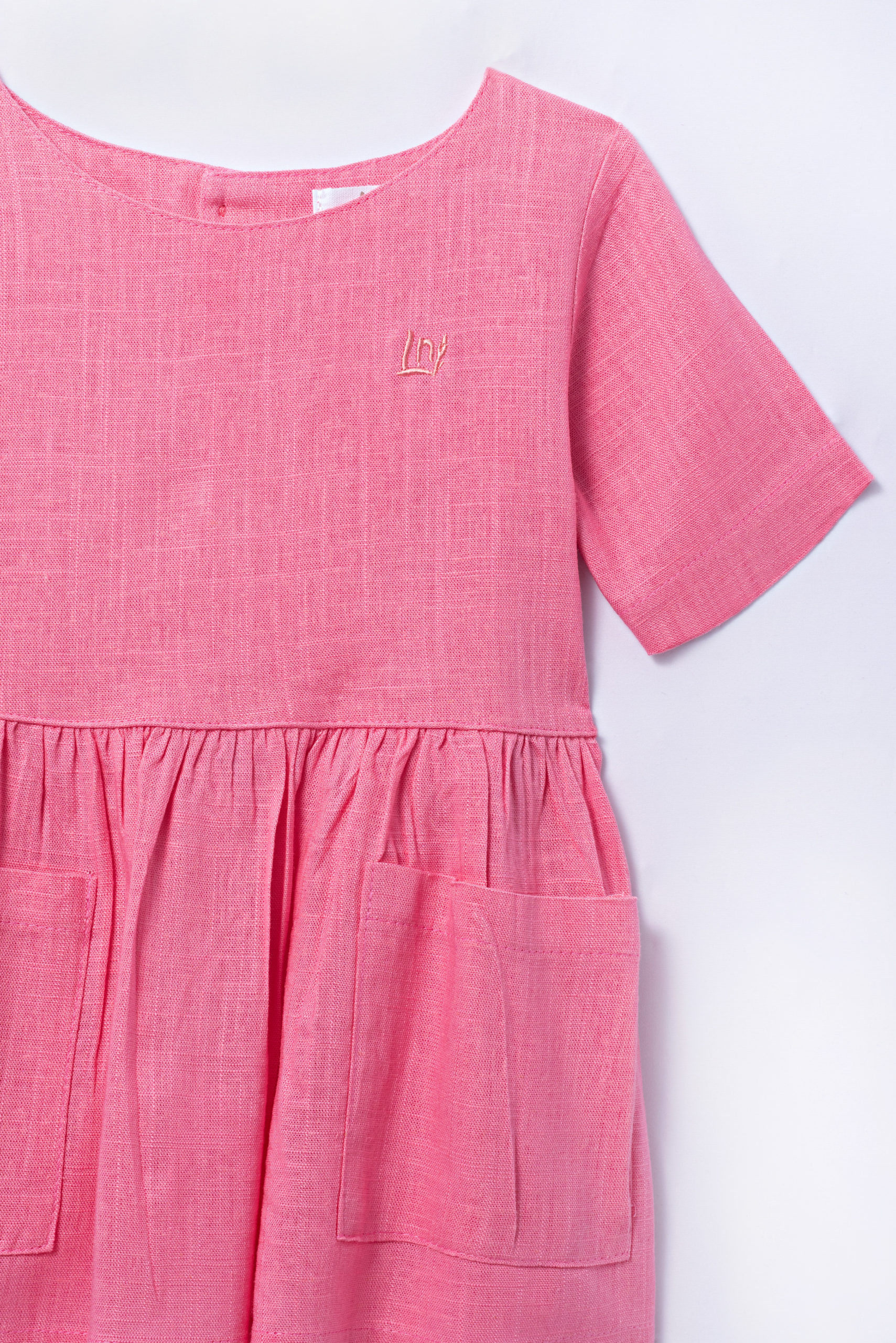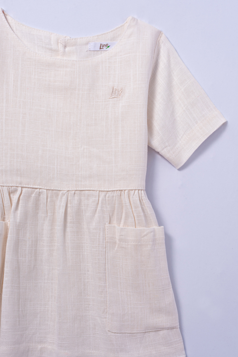 Vestido curto com gola redonda e manga curta. Bolsos na parte da frente e abertura com botões na parte de trás. Detalhes franzidos na cintura. Tecido de linho.