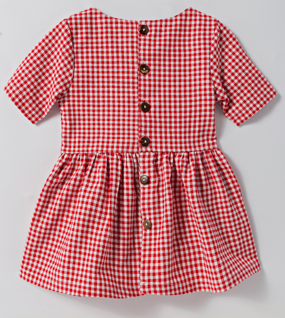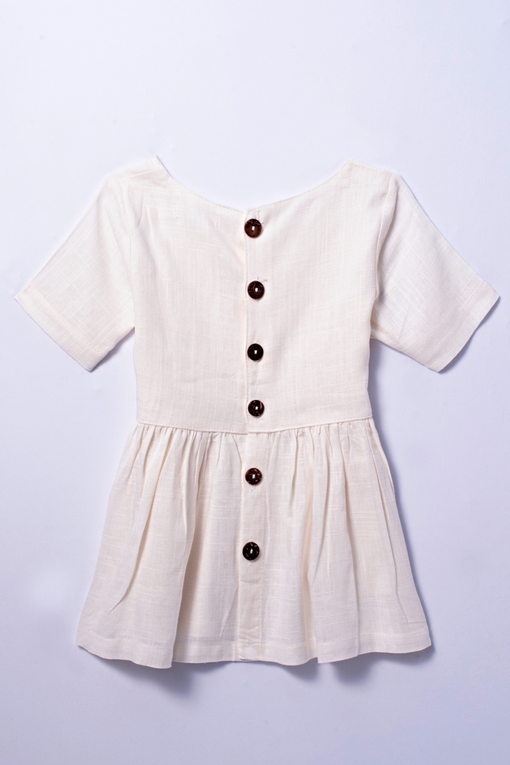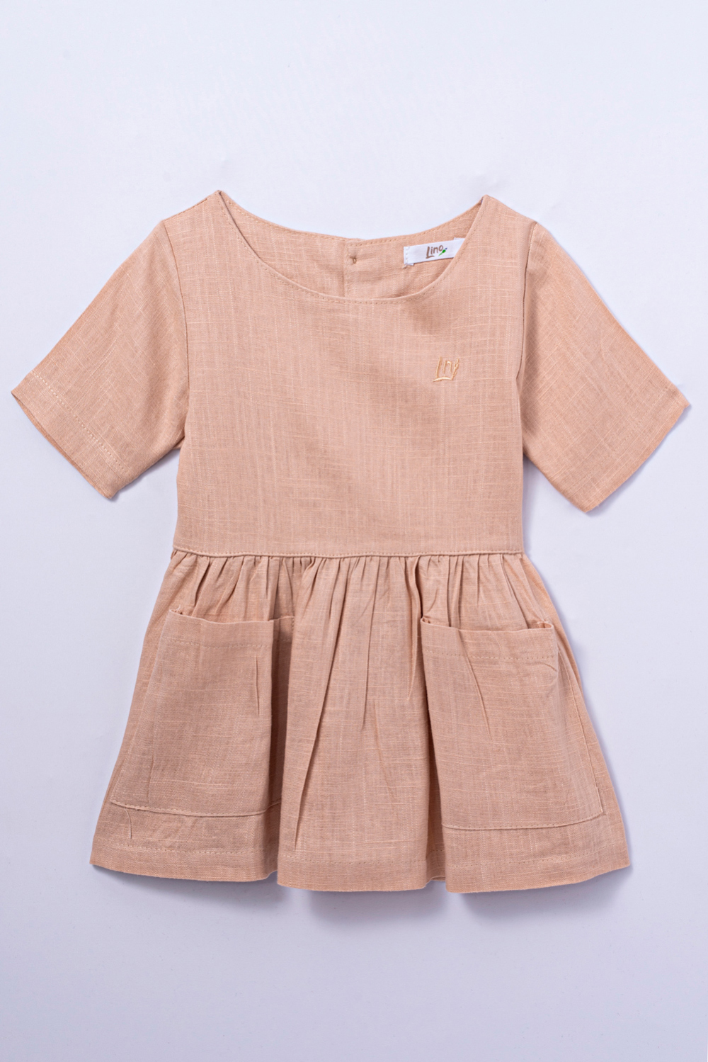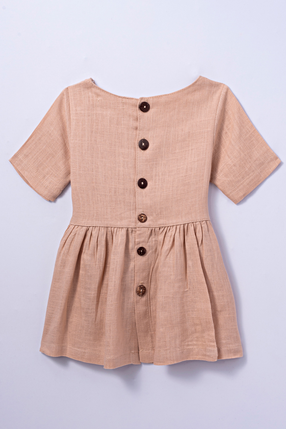 Vestido curto com gola redonda e manga curta. Bolsos na parte da frente e abertura com botões na parte de trás. Detalhes franzidos na cintura. Tecido de linho.