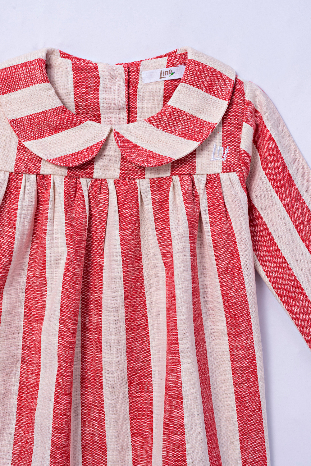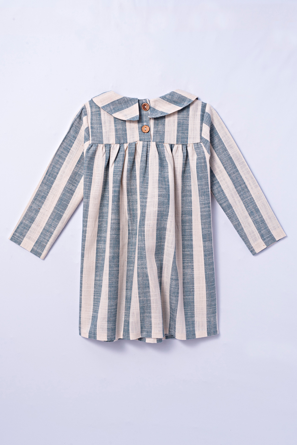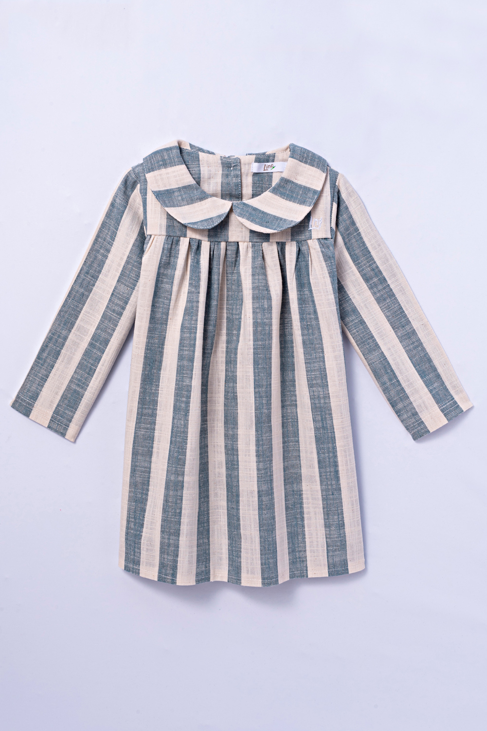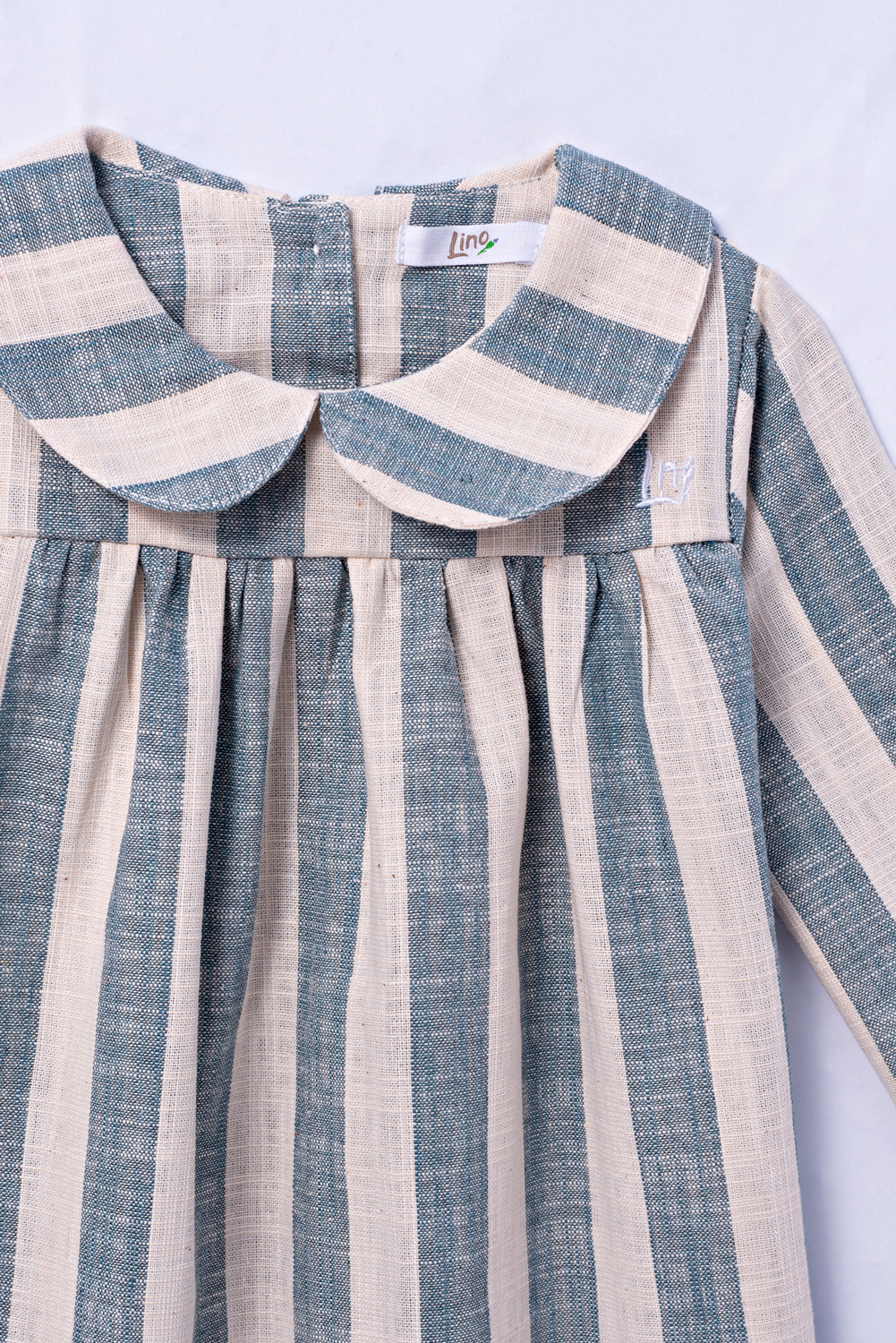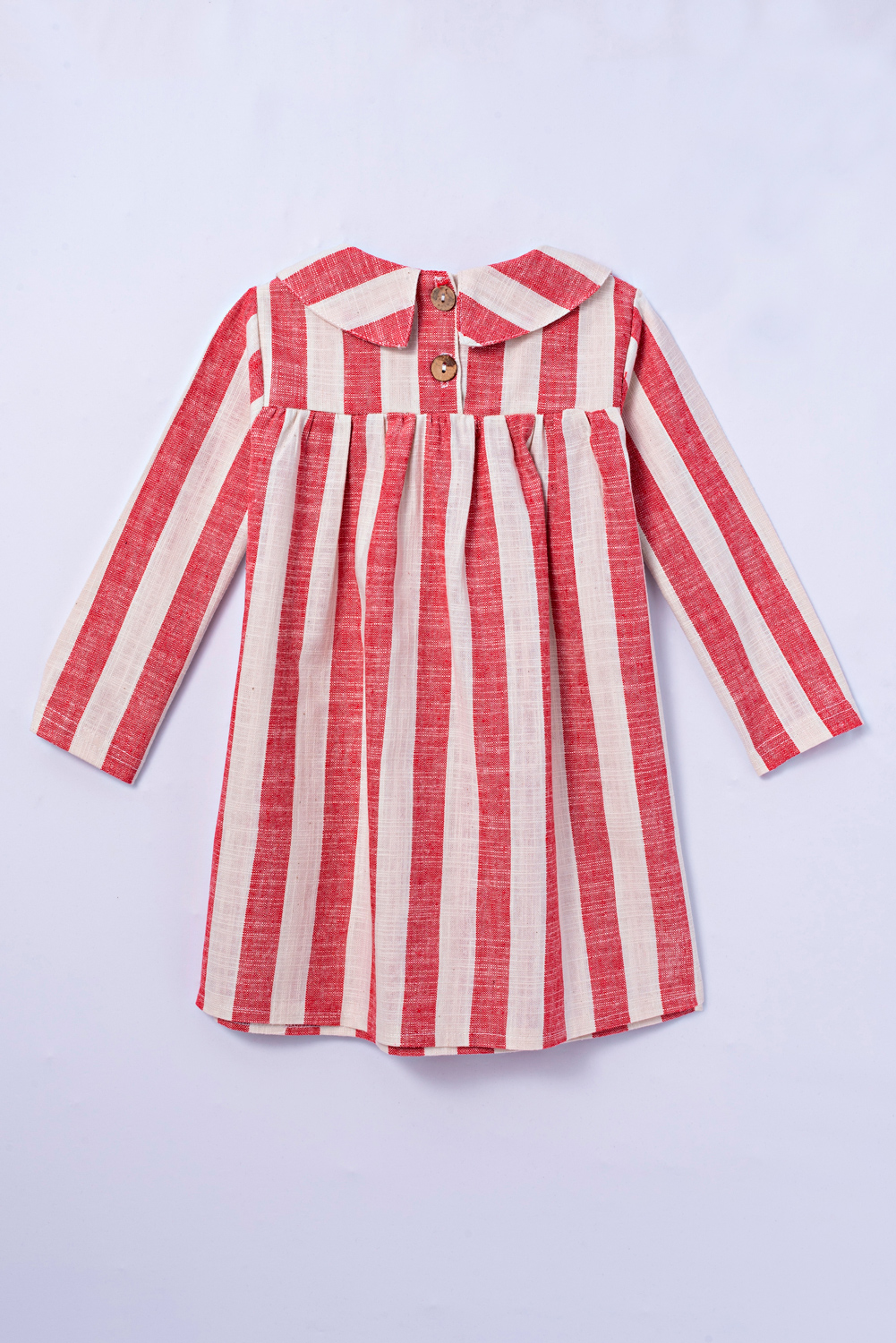 Vestido com manga longa e tecido duplo na parte superior. Gola de boneca pespontada e detalhe franzido na parte do colo. Botões com abertura na parte de trás.